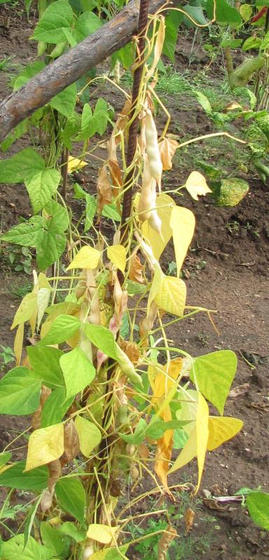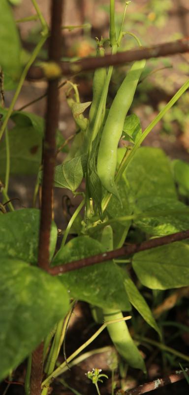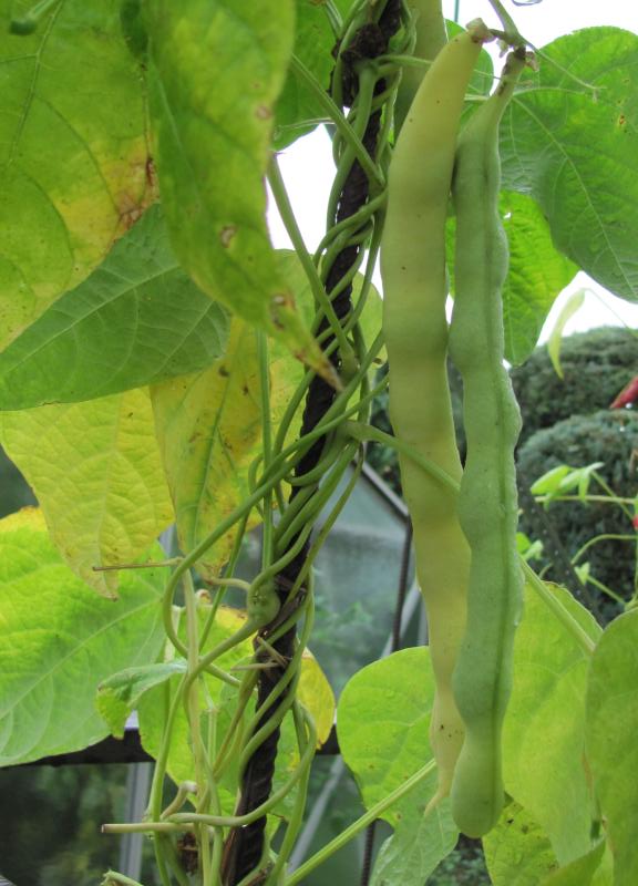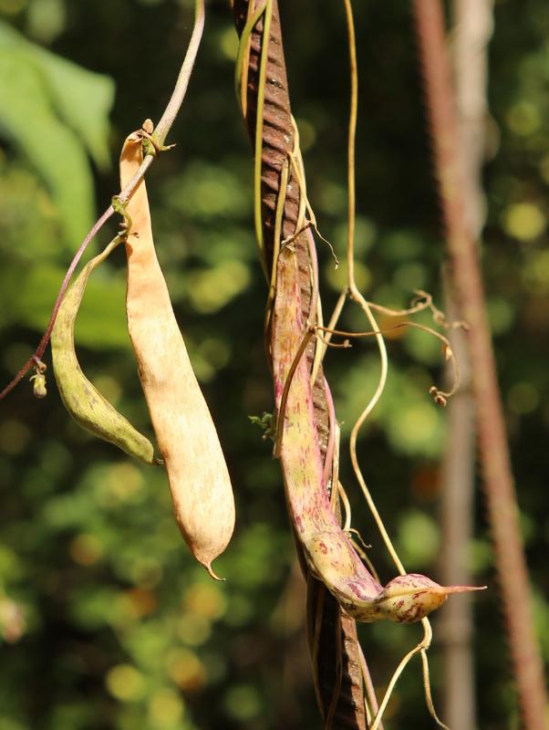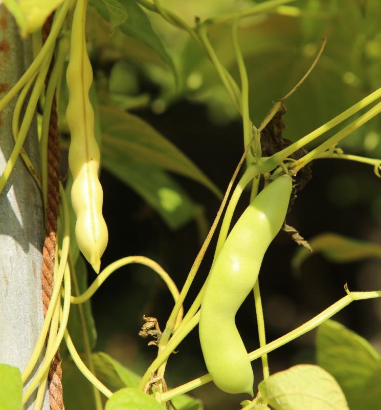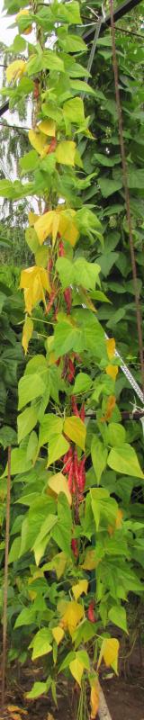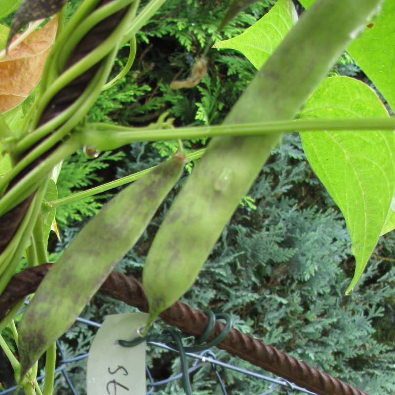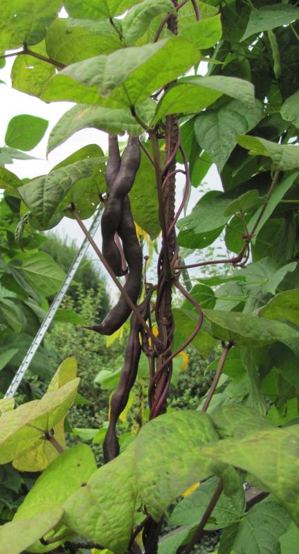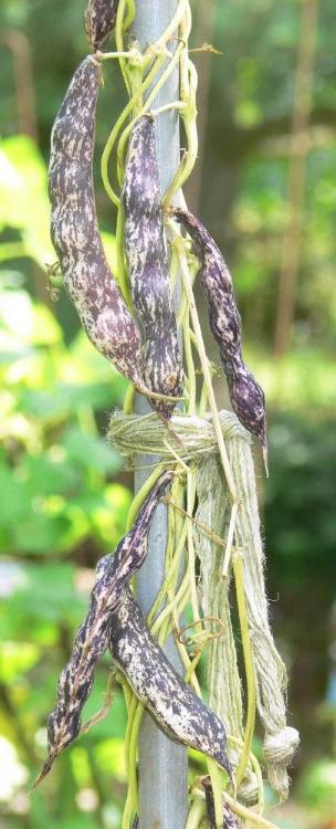 Pfl. nur 1m hoch. Ende August ganze 3 Hülsen (ca. 18cm lang, geradwüchsig) geerntet (9 Kerne). [MHä<24>]