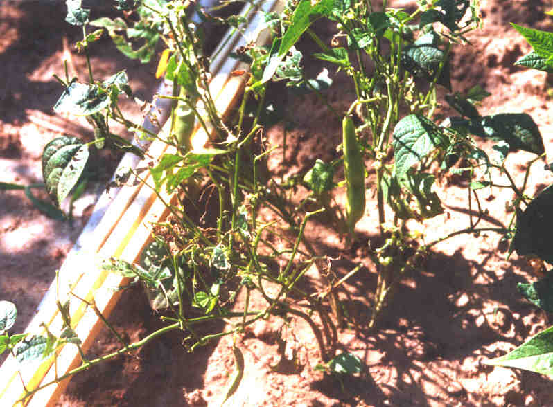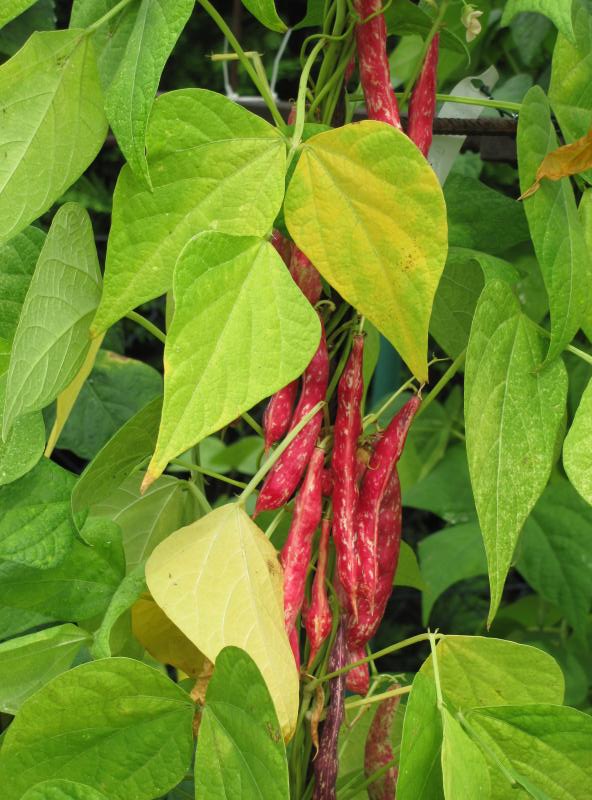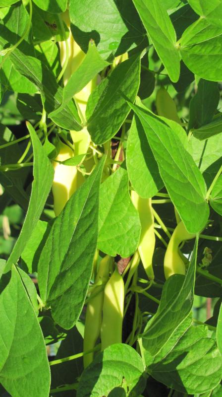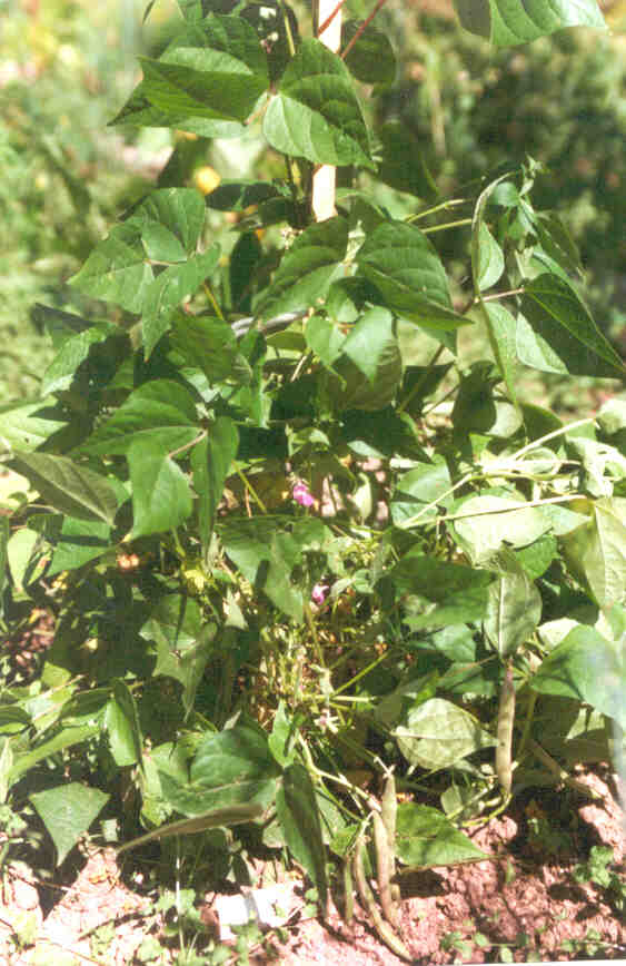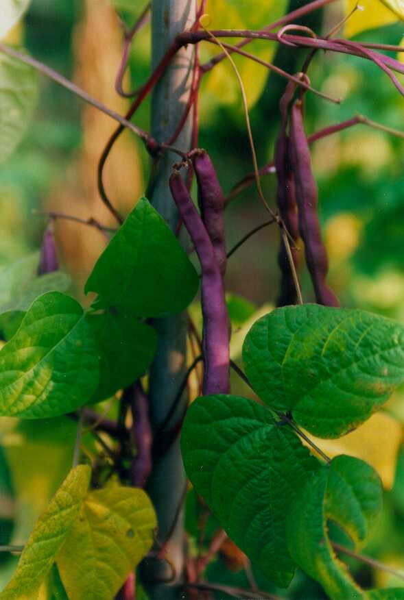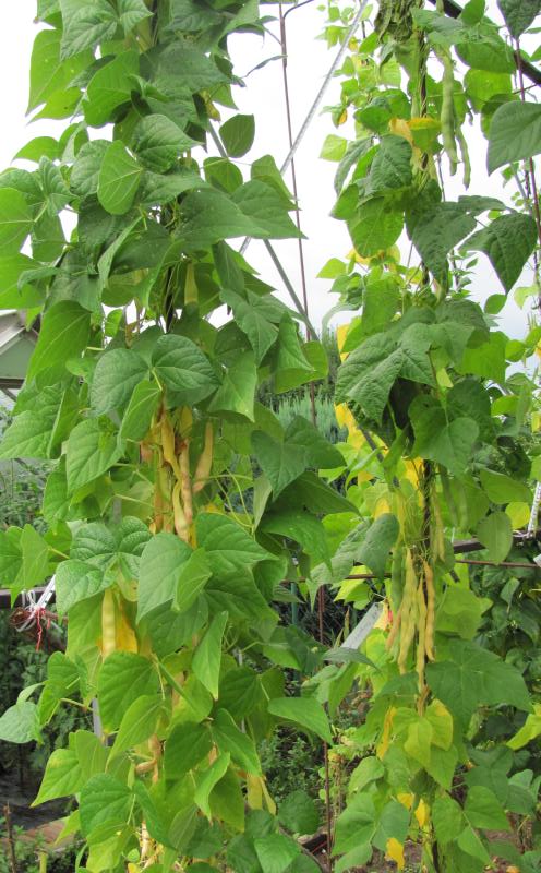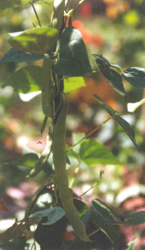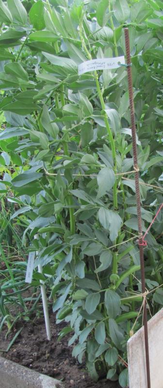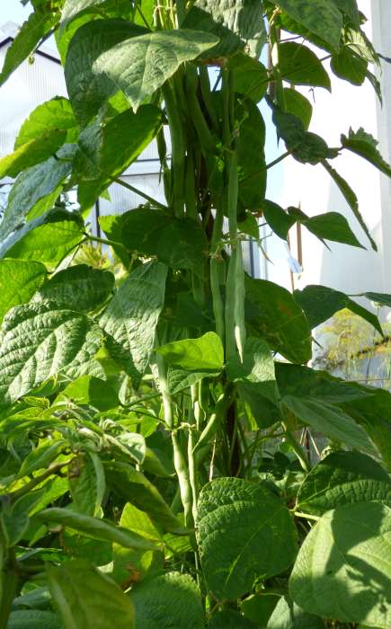 Pfl. nur 1m hoch. Ende August ganze 3 Hülsen (ca. 18cm lang, geradwüchsig) geerntet (9 Kerne). [MHä<24>]