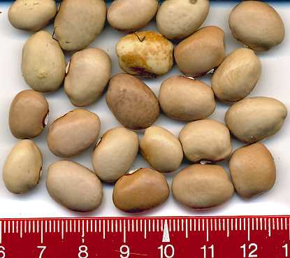 Etliche beige Kerne aufgetreten. Guter Nettoertrag trotz starkem Käferbefall. <16>:Bescheidene Ernte ab 9.8. "Riesig" ist nur eine einzige Hülse (5 große Kerne), weder die Pfl., noch die Hülsen und Kerne wirken ansonsten riesig. [RB<19>]Ertrag 400g; Kerne überwiegend groß. [RB<22>]:Ertrag 310g.