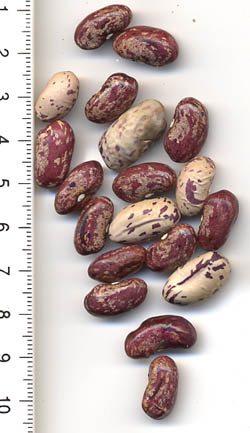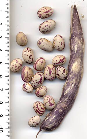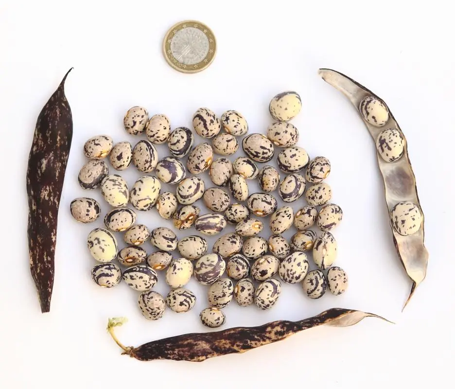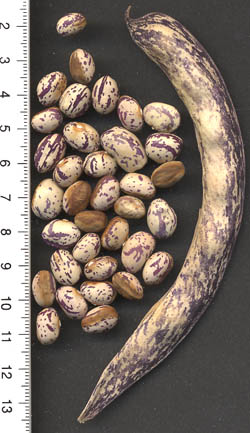 [RH<07>] <16>:Ernte kommt ab 19.8. (2 erste Hülsen) sehr langsam in Trab und ist insgesamt eher mittelspät. Die Kerne sind sehr bunt, der ursprünglich "Belag" ist nur auf wenigen erkennbar (rechts im Bild