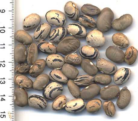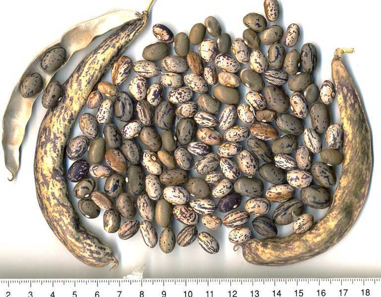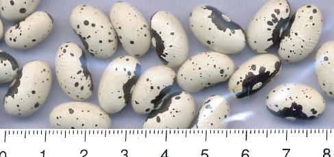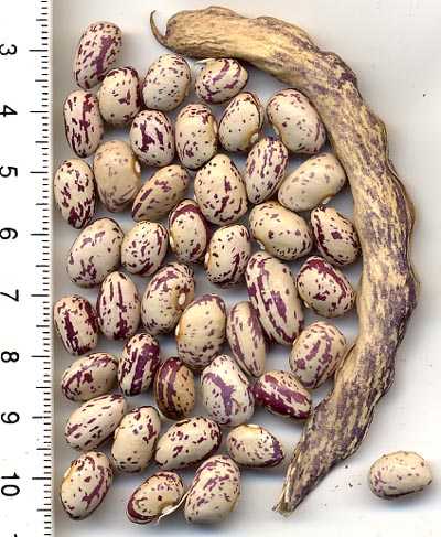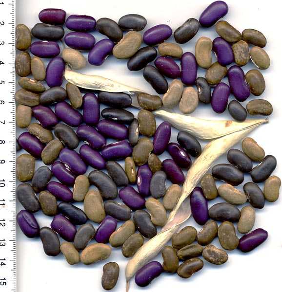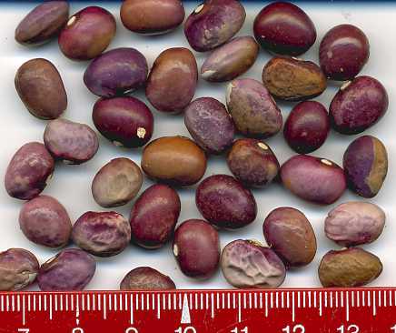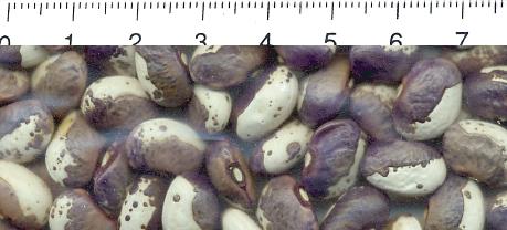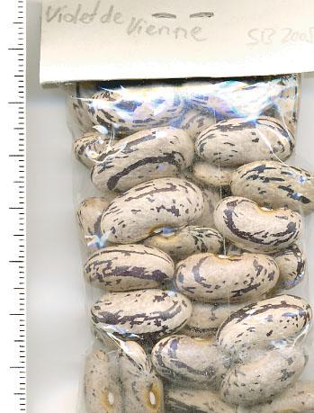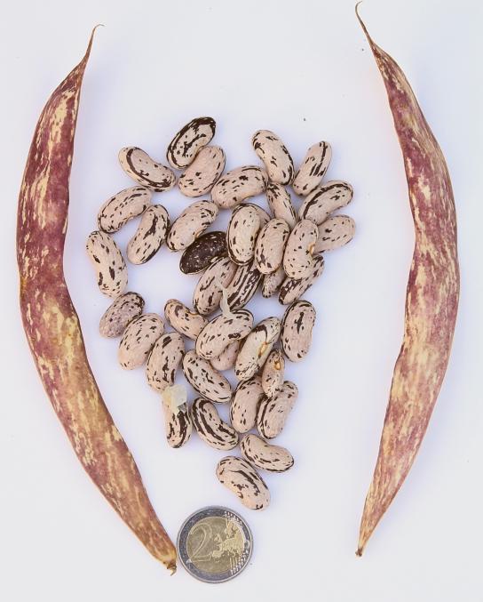 Hülsen lila-beige gemustert, breit-fleischig. Kerne tendieren zur