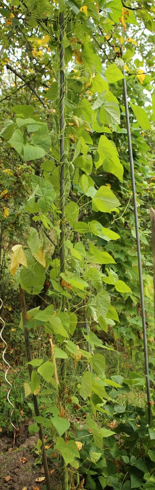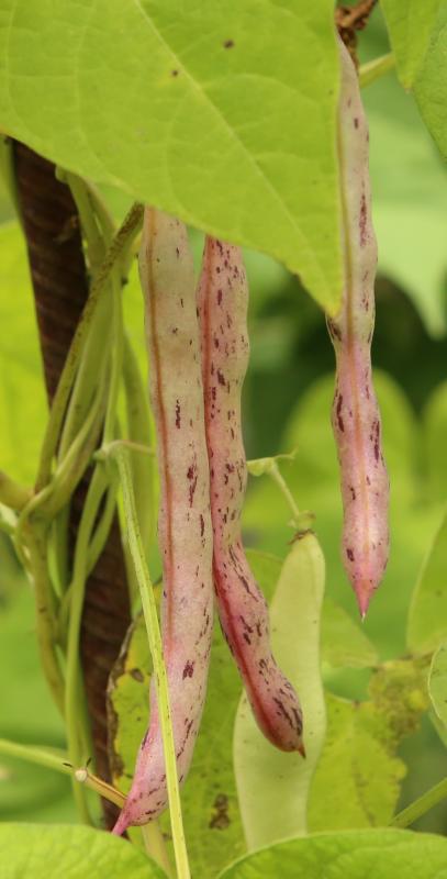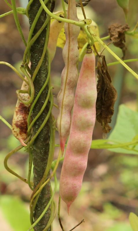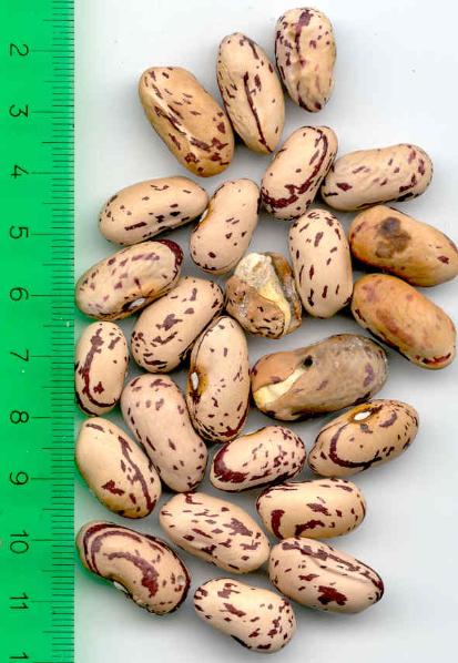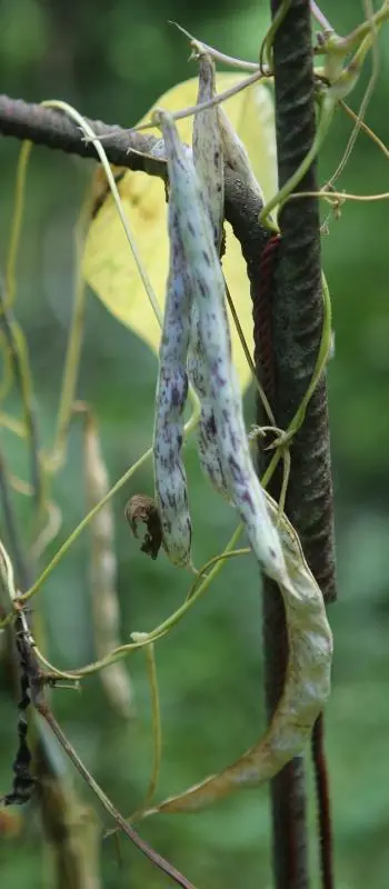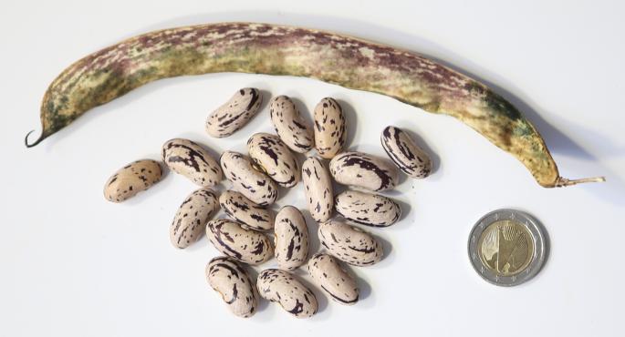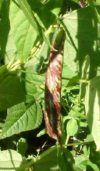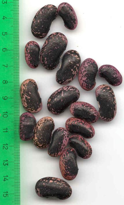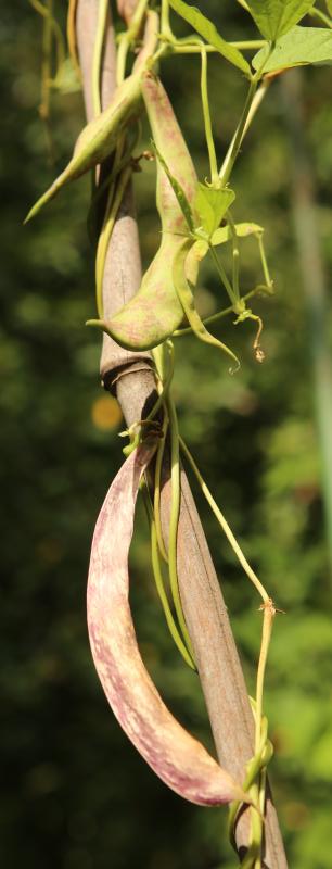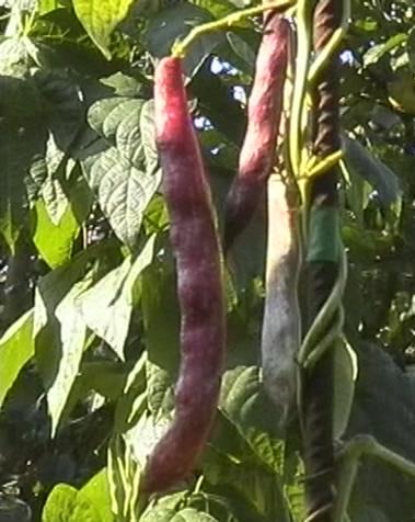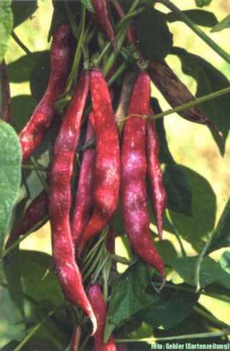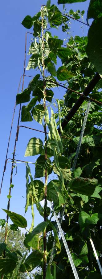 abgeerntet. Ob diese Sorte unter meinen Klimabedingungen Zweck hat? [MHä<16>] [RB<19>]Hoher Ertrag: Knapp unter 500g. Offenbar nicht mehr sortenrein: Viele Bohnen sind nicht einfarbig, sondern dunkel gemustert. <23>:Pfl. sehr hoch >4m. Sehr später, aber rekordverdächtiger Ertrag. Hülsen ca. 8cm lang, beulig, grün mit zartlila Musterung. Ertragreiche, aber sehr (zu?) späte Sorte.