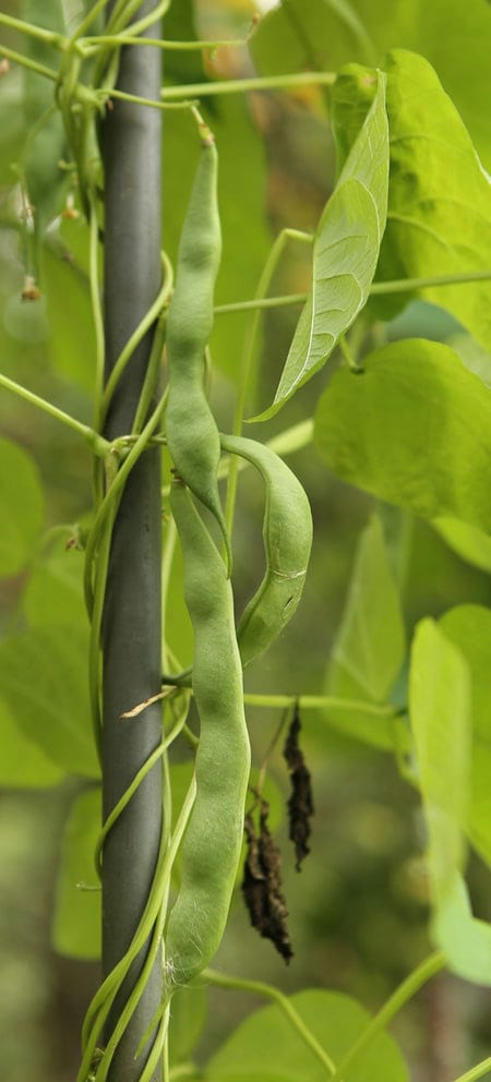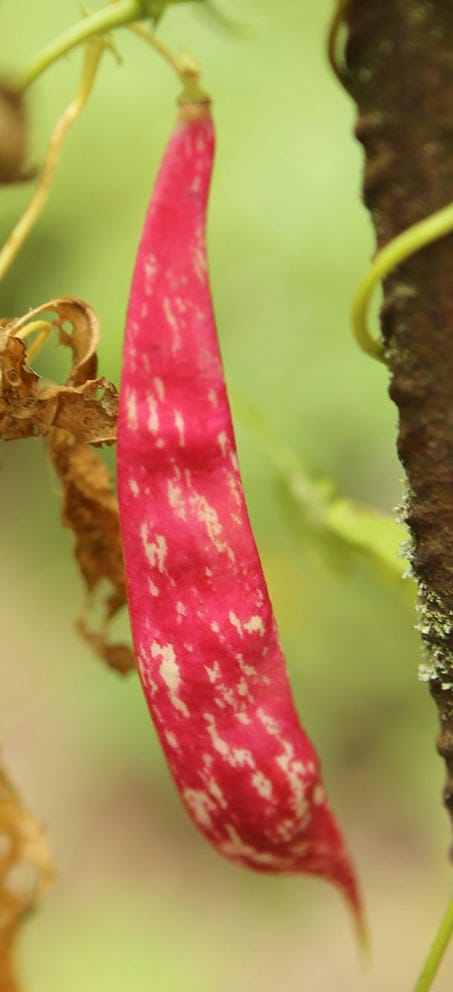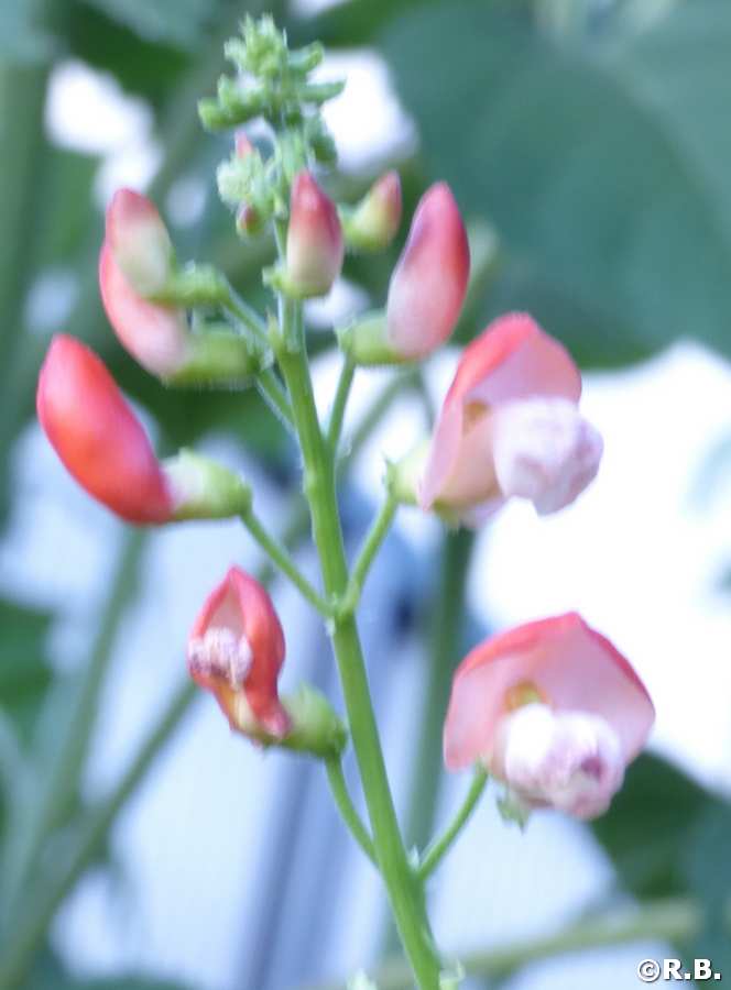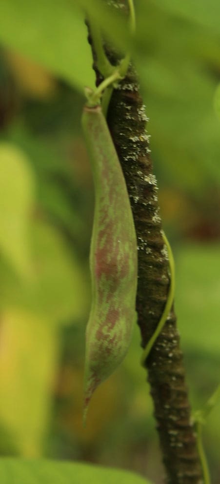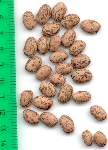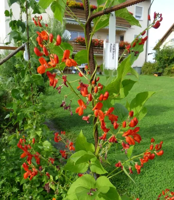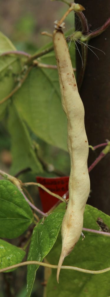 abgeerntet. Ob diese Sorte unter meinen Klimabedingungen Zweck hat? [MHä<16>] [RB<19>]Hoher Ertrag: Knapp unter 500g. Offenbar nicht mehr sortenrein: Viele Bohnen sind nicht einfarbig, sondern dunkel gemustert. <23>:Pfl. sehr hoch >4m. Sehr später, aber rekordverdächtiger Ertrag. Hülsen ca. 8cm lang, beulig, grün mit zartlila Musterung. Ertragreiche, aber sehr (zu?) späte Sorte.