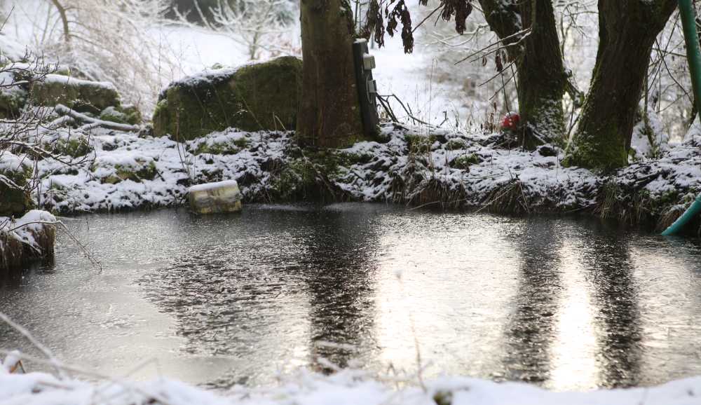 Kaum noch zu glauben, jetzt ist es klirrend kalt (der Teich ist begehbar).