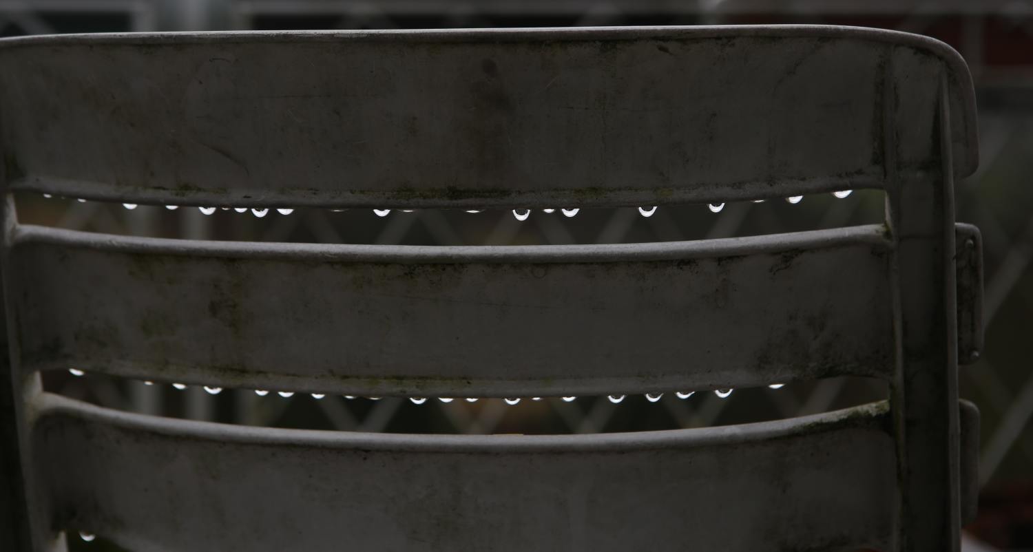 Schon wieder ist es vorbei mit der weißen Pracht. Überall hängen nur noch Tropfen (hier an einer Gartensessel-Lehne).