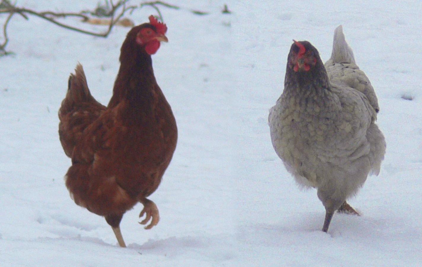 Man sagt ja, Hühner leiden nicht unter kalten Füßen. Mindestens der Henne rechts im Bild möchte man es glauben.