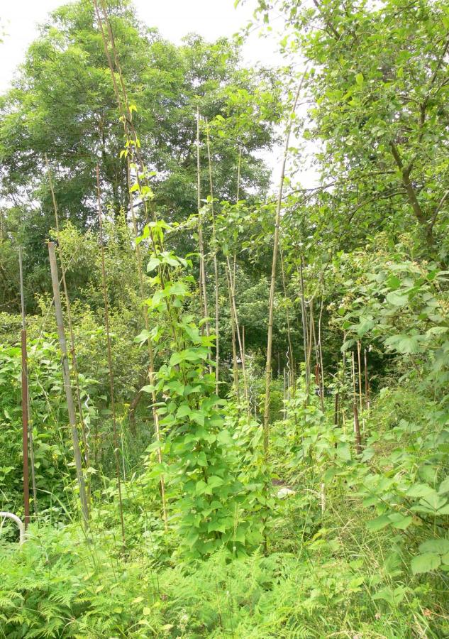 Die Bohnen stürmen heuer zum Himmel und entkommen dem Unkraut, welches durch den vielen Regen ebenfalls üppig gedeiht.