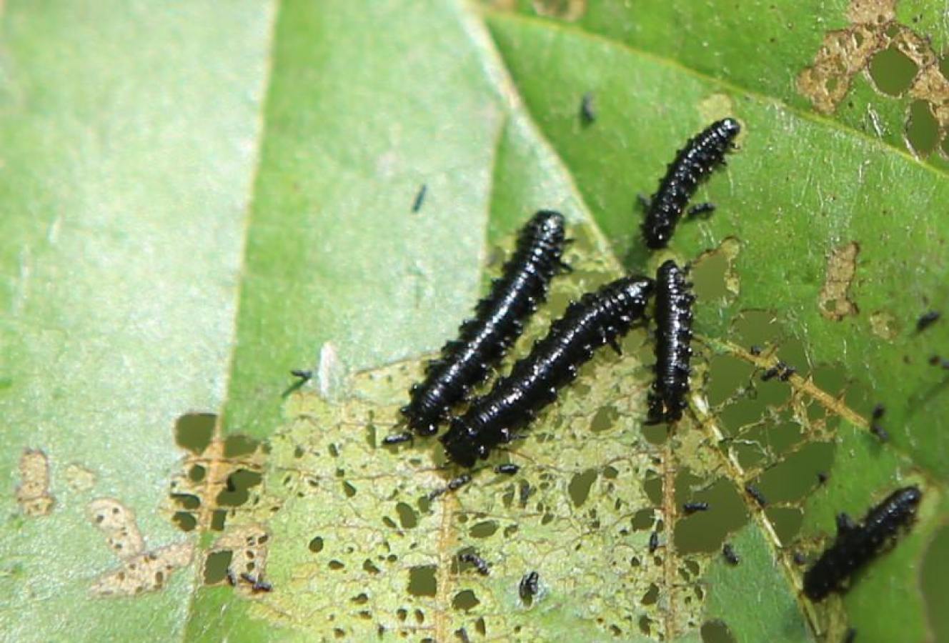 Leider habe ich nicht herausfinden können, zu welcher Käferart diese kleinen "Räupchen" (Länge<1cm) gehören, die in großer Zahl am Ufer eines Baggersees Löcher in die Blätter der dortigen Weiden fraßen.