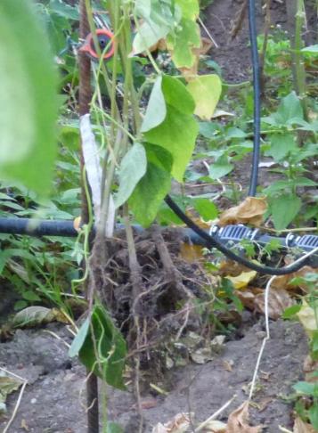 Mit Stangenbohnen hatte ich 2018 wenig Glück (s. Bohnenseite). Dass 2018 eigentlich ein ausgesprochen ergiebiges Bohnenjahr war, bewies einer meiner Gartenfreunde. Er wässert nämlich seine Pflanzen kontinuierlich mit einer Tröpfchenbewässerungsanlage. Dass unter diesen Bedingungen nichts passieren kann, stimmt aber leider auch nicht, wie die Bilder unmittelbar nach einem "Sommerorkan" am 28. Juli zeigen. Der Angriff der Böen war so heftig, dass es manche Pflanzen sogar ganz aus dem Boden riss (was Bohnen gar nicht gut abkönnen!).