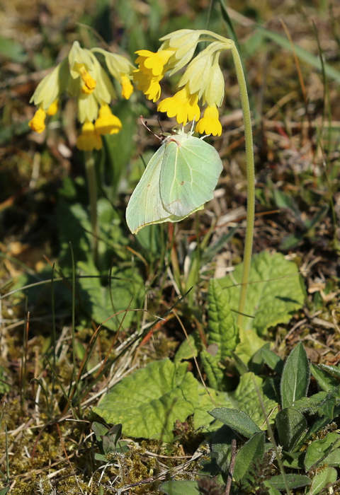 Übrigens: Auch Zitronenfalter haben enorm lange Saugrüssel, mit denen sie problemlos in den Grund der tiefen Blüten kommen. Das fällt nur nicht so auf, weil Schmetterlinge ihre Mundwerkzeuge erst beim Saugvorgang ausrollen. Hier im Bild ein Weibchen, welches anders als die kräftig gelben Männchen blass-grünlich schimmert.
