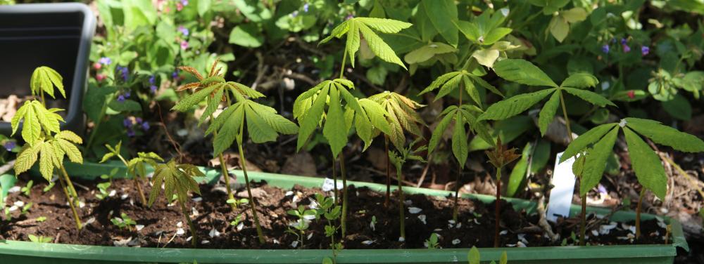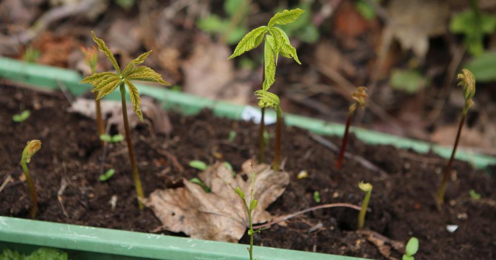 Im Herbst 2019 sammelte ich Kastanien und steckte sie in einen Blumenkasten. Anscheinend sind sie fast alle gekeimt und erfreuen sich guter Gesundheit (das untere Bild zeigt sie nur eine Woche später). Für eine Saison will ich sie noch im "Babykasten" beobachten, ehe ich sie ins Freiland pflanze.
