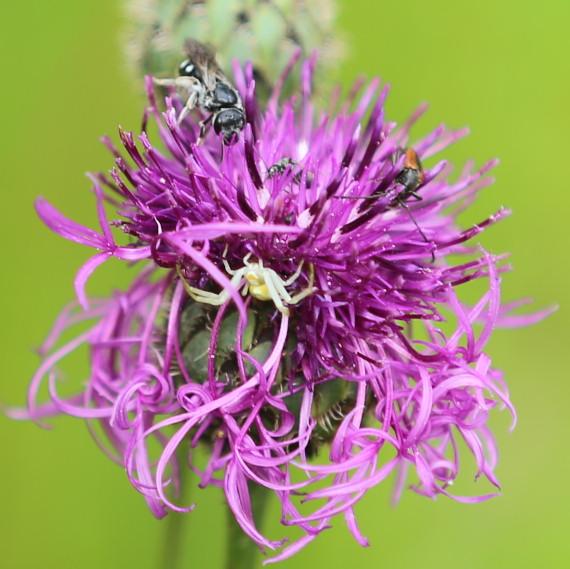 Wer dem Frieden allerdings zu sehr traut, wird alsbald Opfer der veränderlichen Krabbenspinne (unteres Bild Mitte), die es in meiner Wiese reichlich gibt.