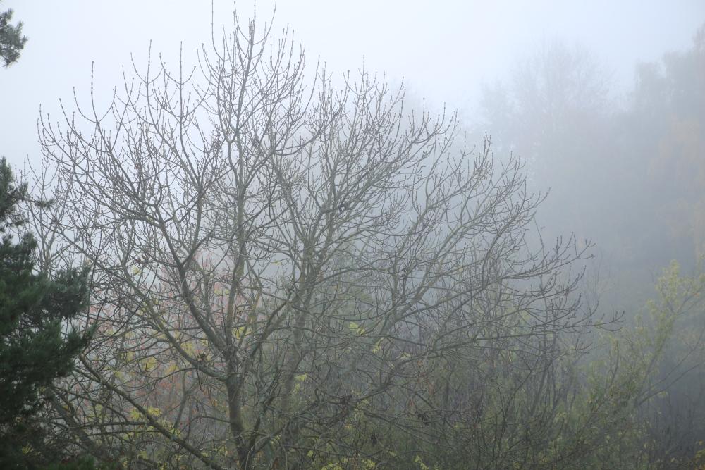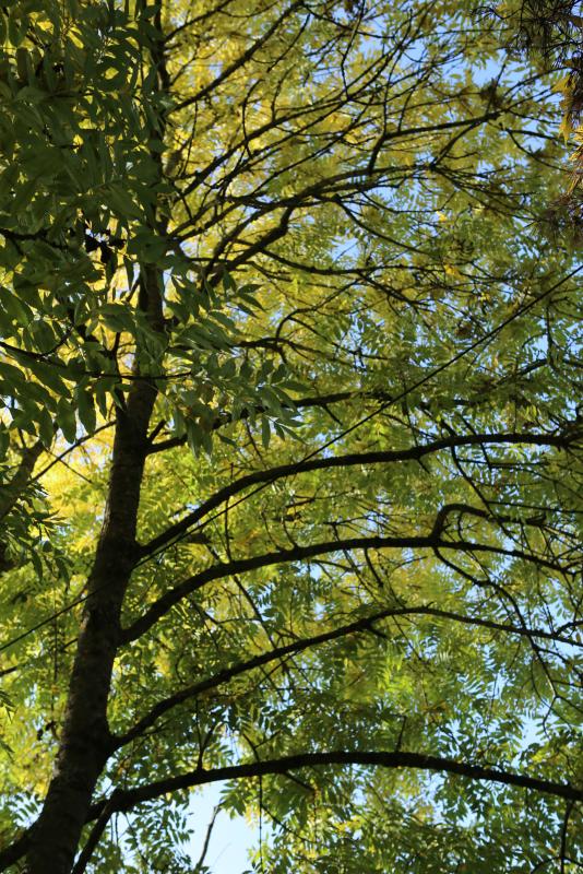 Ungefähr 1985 pflanzte ich eine kleine Esche an den Rand meines Gartenteichs (im ersten Bild unten zu erkennen). Inzwischen ist das - wie man sieht - ein mächtiger Baum, dessen Laub im Frühherbst eine schöne gelbgrüne Farbe annimmt. Das zweite Bild zeigt den Blick gleichsam von innen nach außen. Und 14 Tage später ist der Baum schon kahl.