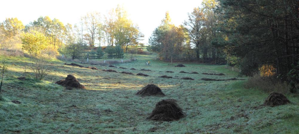 Wenn man eine Wiese als Bunte-Wildblumen-Standort erhalten will, muss man sie abmähen, und zwar möglichst spät, damit auch spät blühende Pflanzen eine Chance haben. Das Heu muss anschließend abtransportiert werden. Dieser Akt steht mir hier noch bevor.
