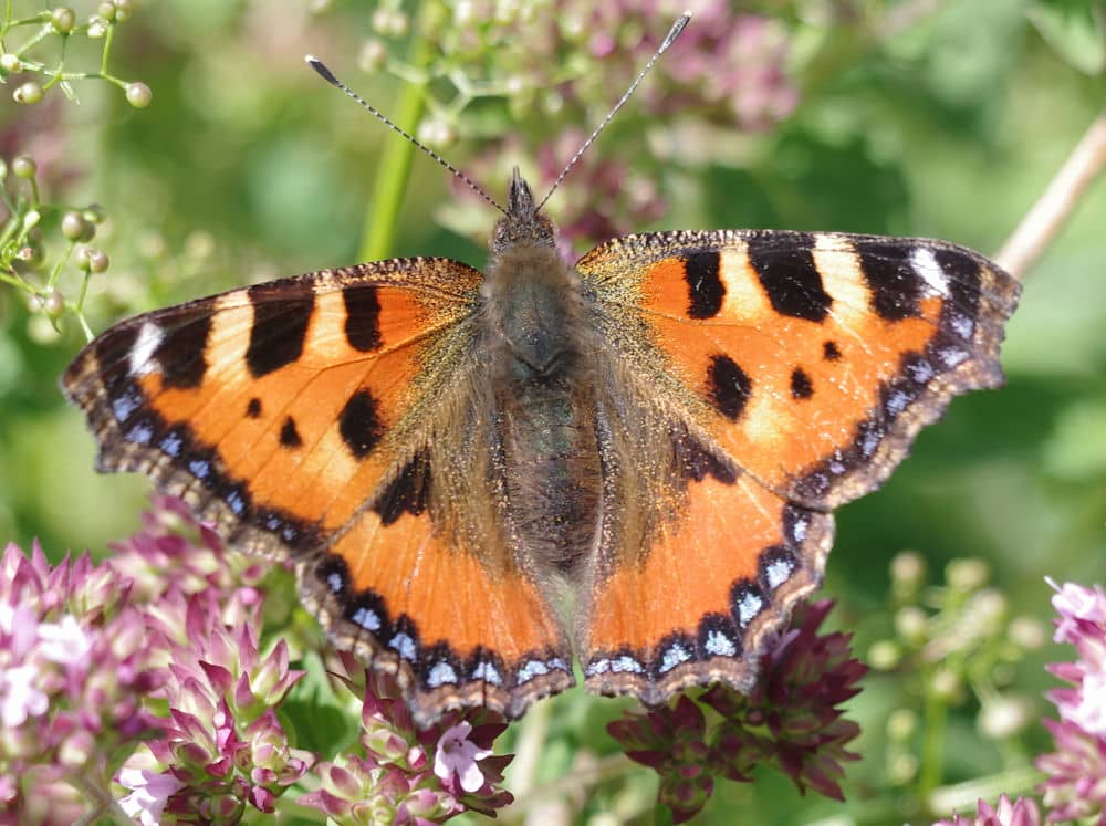 HobbygärtnerInnen kennen diesen hübschen Falter; denn er labt sich gern am Nektar der Buddleja-Blüten. Im Frühjahr genießen die Falter meine sonnenbeschienene Hauswand, um sich aufzuwärmen. Den Falter am normalen Aufenthaltsort zeigt das zweite Foto.