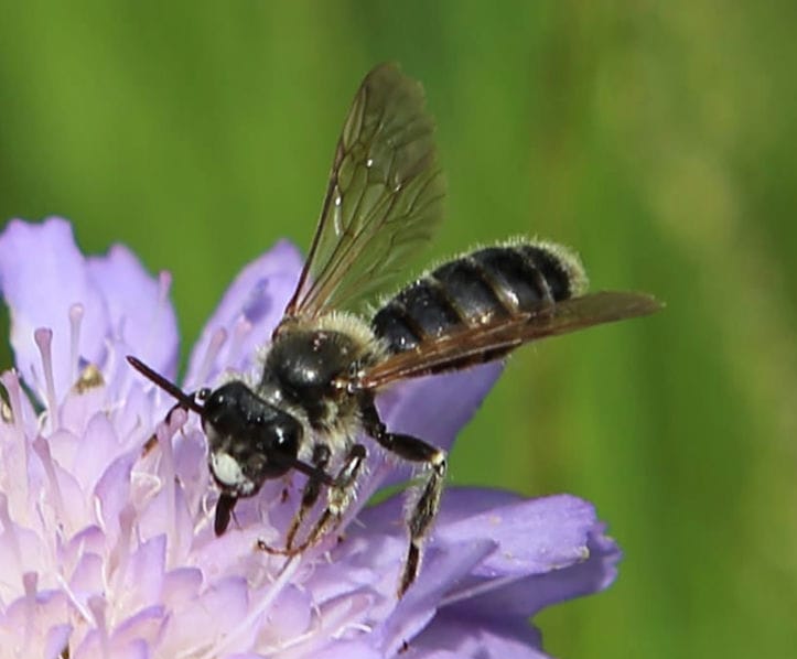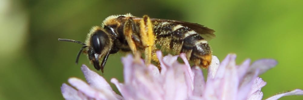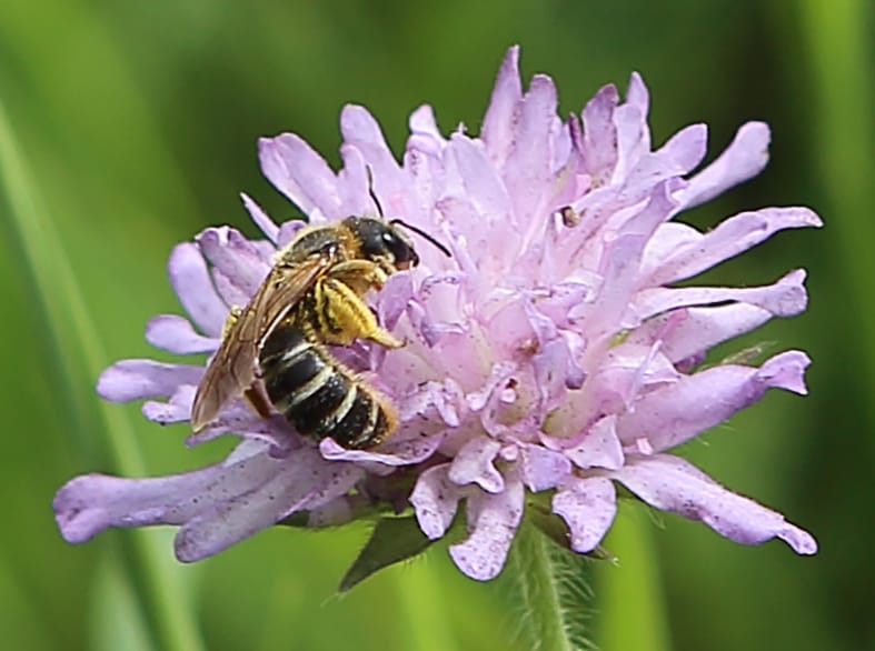 Auch andere kleine Insekten sind im Hochsommer sehr aktiv- hier die Gelbbindige Furchenbiene (Halictus scabiosae)