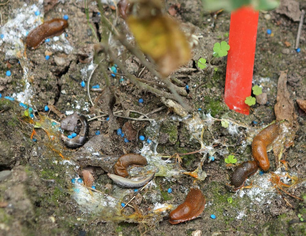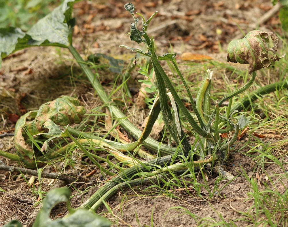 Mit schreckgeweiteten Augen habe ich in diesem Jahr das Treiben der Schnecken erlitten. In meiner Not habe ich sogar punktuell Schneckenkorn ausgestreut. Aber das zeigte mir nur den augenblicklichen Erfolg meines Vernichtungsfeldzugs, half aber nicht gegen immer neue Angriffswellen der unerschöpflichen Schneckenheere. An eine Ernte war vielfach nicht zu denken, wie das letzte Bild einer schwer gezeichneten Zuchinipflanze zeigt.