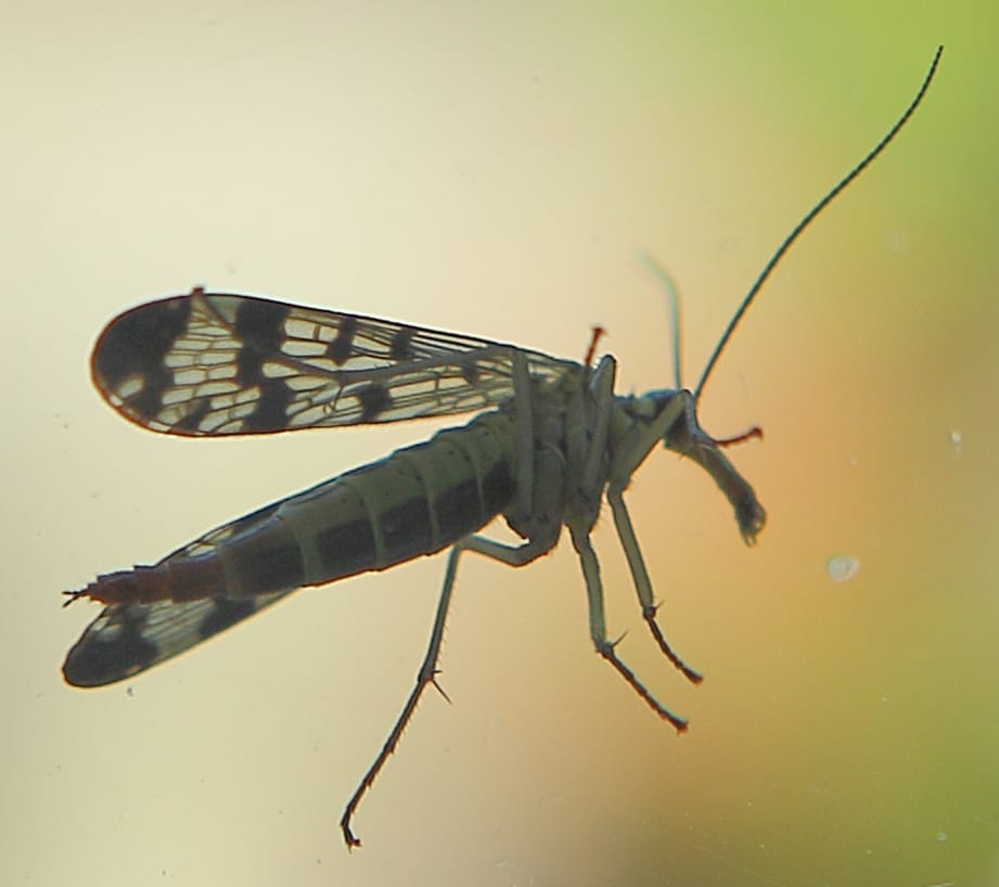 dieses tote Insekt, ein Skorpionsfliegen-Weibchen (Panorpa communis).
