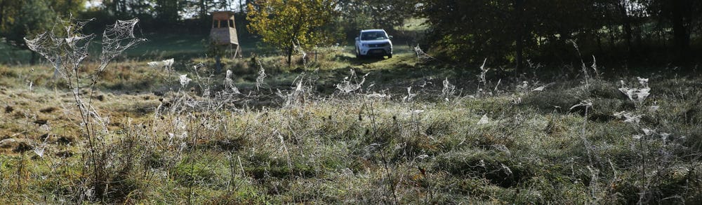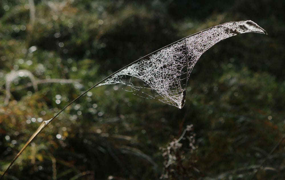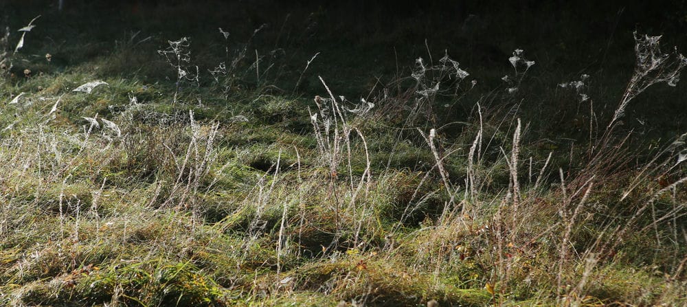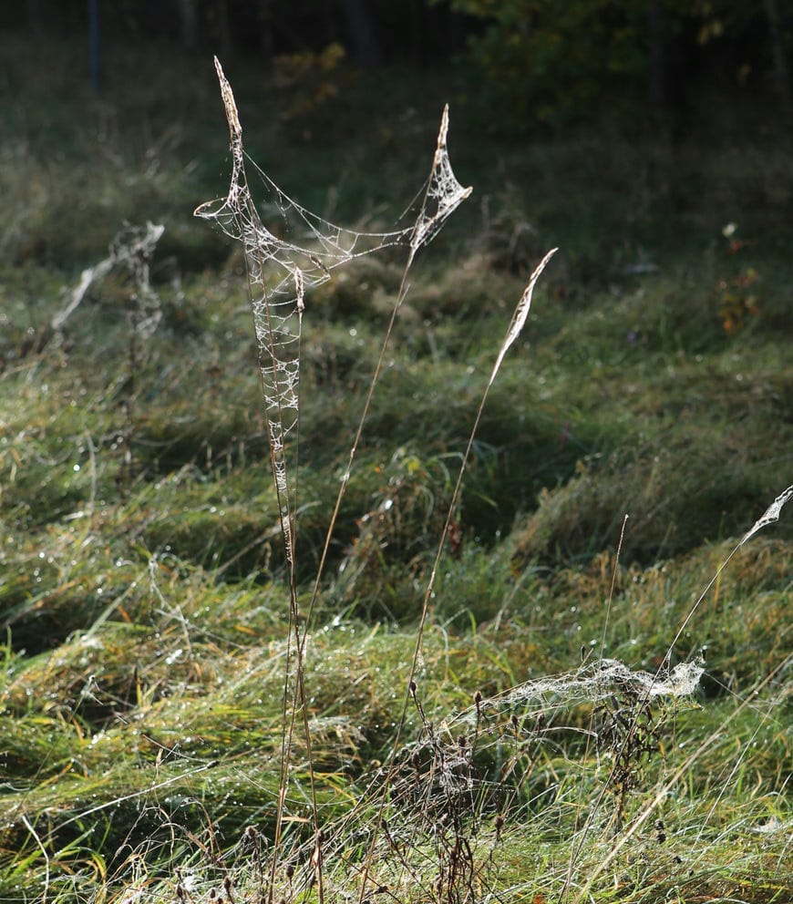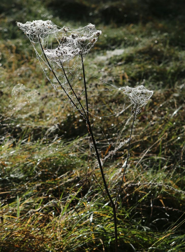Wenn im Oktober Hochnebel herrscht, durch den gegen Mittag die Sonne bricht, habe ich für ziemlich kurze Zeit das Glück, meine Wiese über und über mit Spinnweben zu erleben. Erstaunlich welche ästhetische Reize ausschließlich der Funktion verpflichtetes Gebilde ausüben können. Wenn man sich vorstellt, dass diese Spinnweben auch im Sommer die Wiese überspannen und man sie nur nicht sieht, würde man gern wissen wollen, welcher Prozentsatz von Insekten ihr Leben in diesen tückischen Fallen aushauchen.
