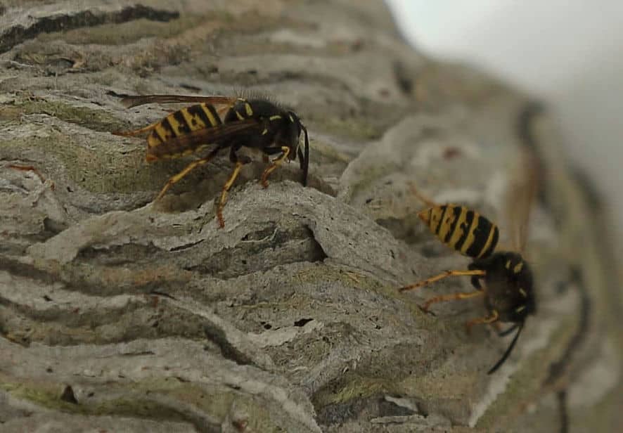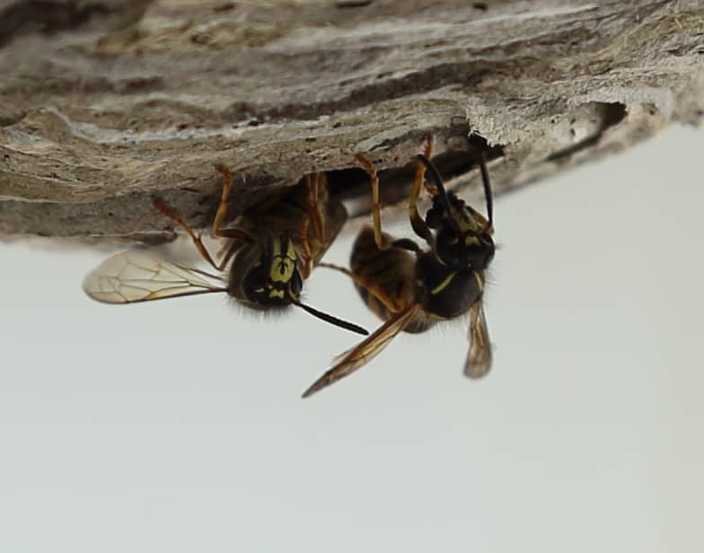 Ein besondere Erlebnis wurde mir zuteil, als ich nach längerer Pause an meinem Balkontisch Platz nehmen wollte und mir binnen Sekunden vier Wespenstiche einfing. Erst nach ausgiebiger Suche entdeckte ich dieses hablkugelige Nest unter der Tischplatte. Die Sächsische Wespe baut keine allzu großen Nester und gilt eigentlich als relativ friedlich. Aber - selbstverständlich! - rütteln am Balkontisch (beim Hinsetzen fast unvermeidlich) provoziert sie zur Verteidigung ihrer Behausung. Als ich später langsam um den Tisch herumschlich, ohne ihn zu berühren, konnte ich mich dem Nest auf einen Meter nähern, ohne einen Angriff auszulösen.
