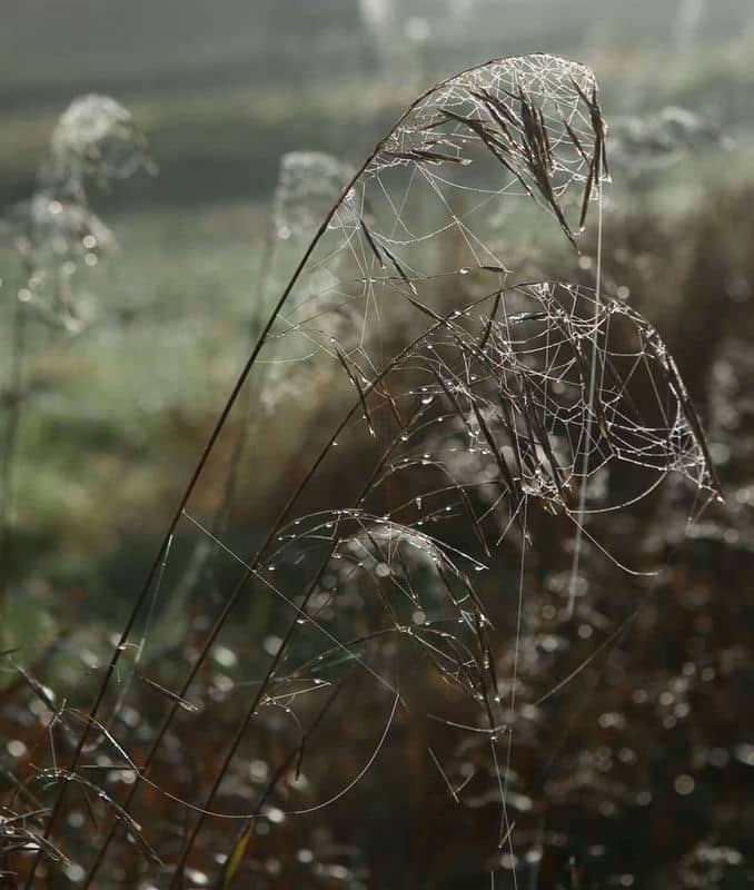 Dort wo auf meiner Wiese gerade keine Gehölze aufkommen, lasse ich sie gerne ungemäht. Das ist eine Voraussetzung, um im Spätherbst Spinnweben zu beobachten. Die zweite wichtige Voraussetzung ist eine spezielle sehr kurzzeitige Wettersituation: Morgensonne nach kalten Nächten (mittags ist der Morgentau schon wieder weg). Unglaublich, wieviele Spinnen mit ihren Fangnetzen auf einer wilden Wiese auf Beute lauern. Manche scheinen dabei künstlerisch anspruchsvoll vorzugehen, andere Netze wirken etwas "schluderich" aufgespannt. Man müsste einmal die Netzkonstruktionen im Hinblick auf die Effizienz im Verhältnis von Sorgfalt und Materialeinsatz zu Beutefang untersuchen. Aber dieser "Forschungsansatz" wäre vermutlich zu kurz gegriffen; denn es geht ja sogar ganz ohne Netz (sprich: Materialeinsatz), wie viele erfolgreiche Spinnenarten beweisen.