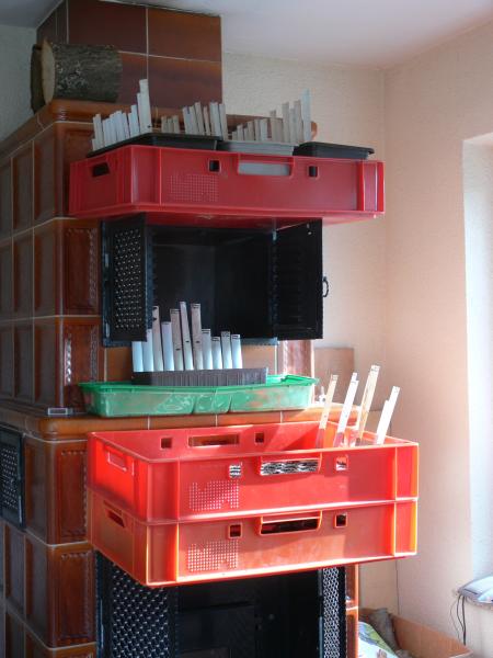 Dann kommen die Kisten zum "Ausbrüten" auf die Heizung bei 25-30°C.