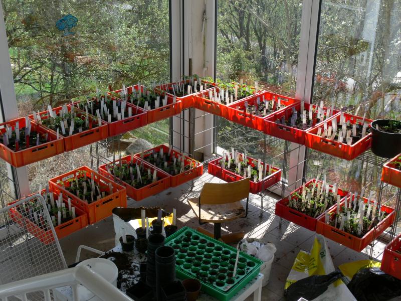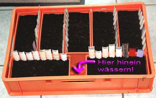 Die Aussaatkästchen kommen bei mir in wasserdichte Metzgerskisten. Dann muss man nicht von oben sprühen oder gießen. Damit würde man leicht wieder die Saat freispülen. Bewährt ist die reichliche Wässerung von unten.