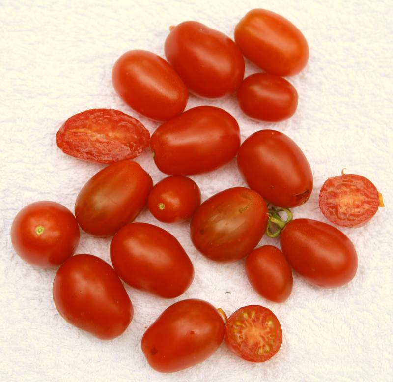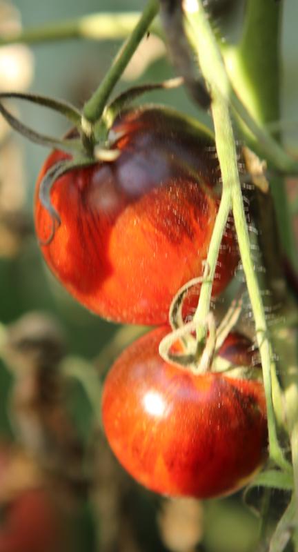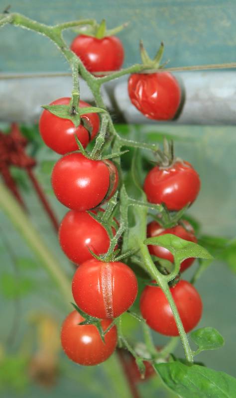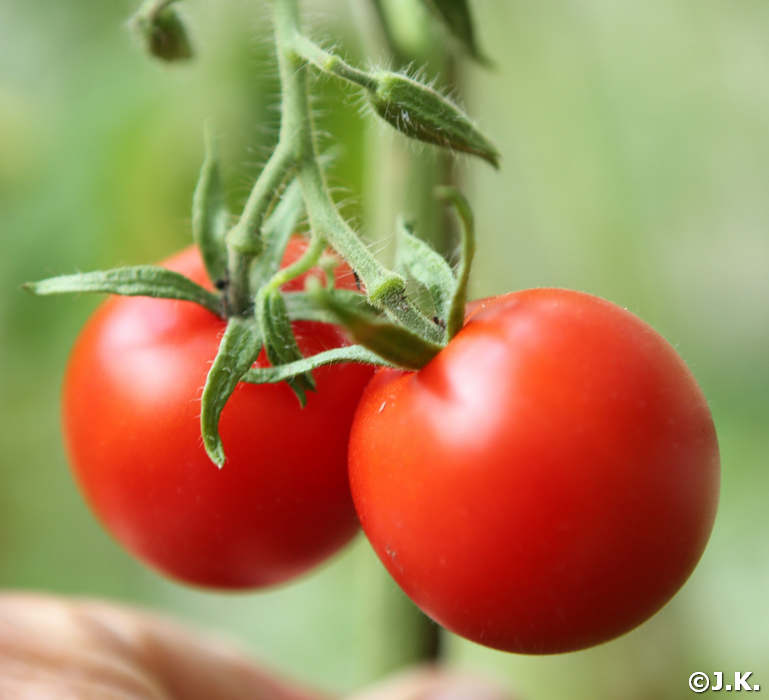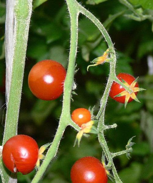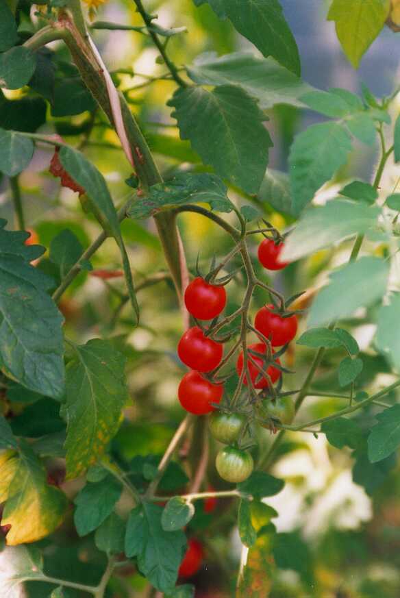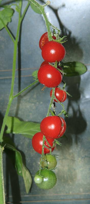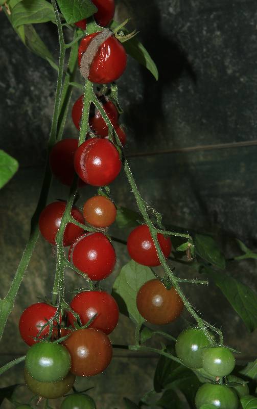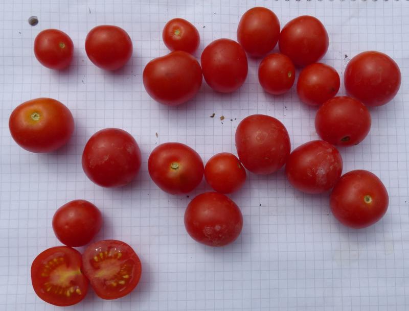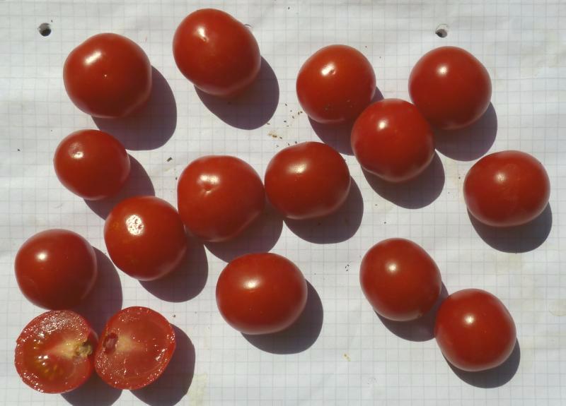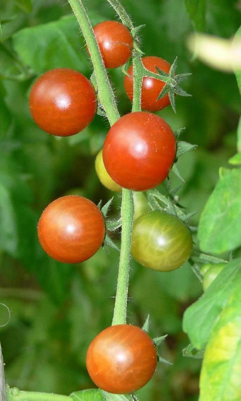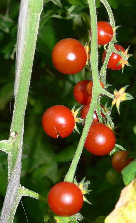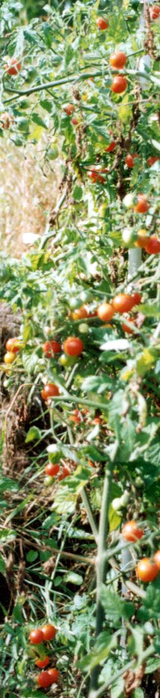 Kirschtomaten (bis 3cm) von 2,5m-Pfl., die selten platzen. Wohlschmeckend,