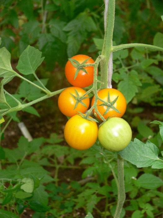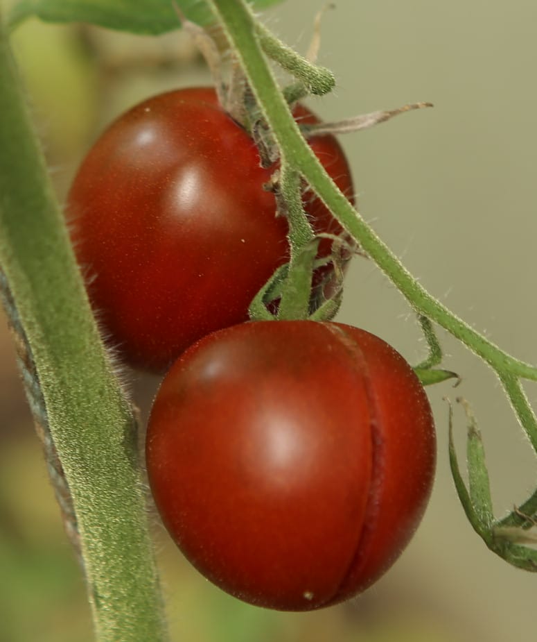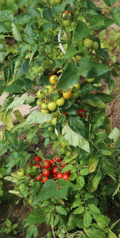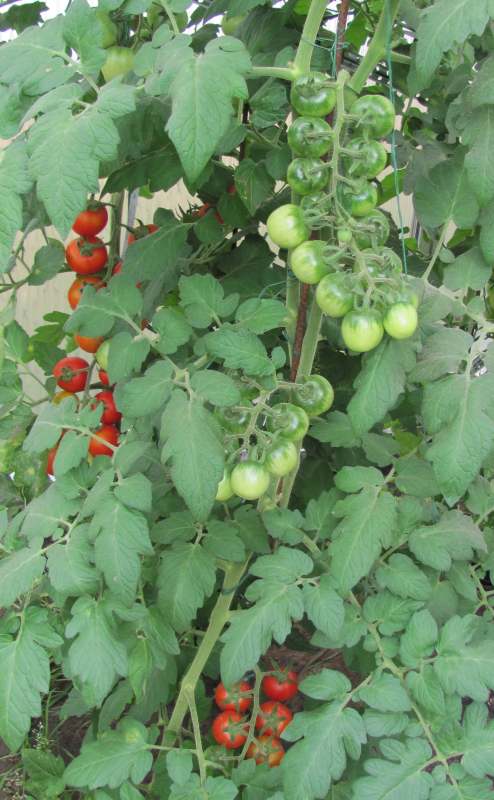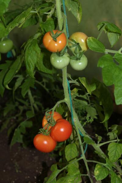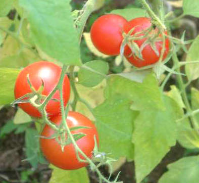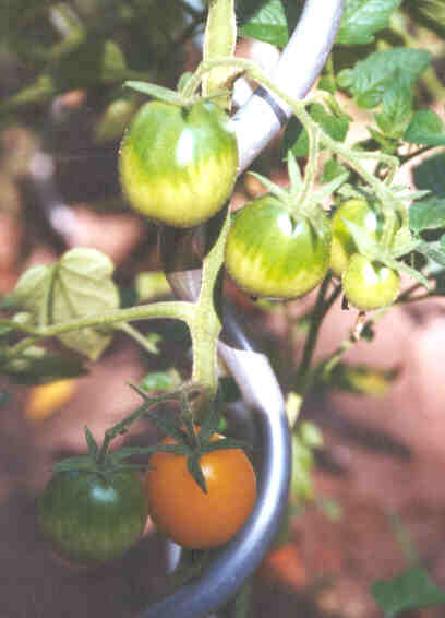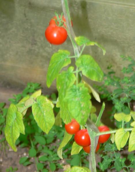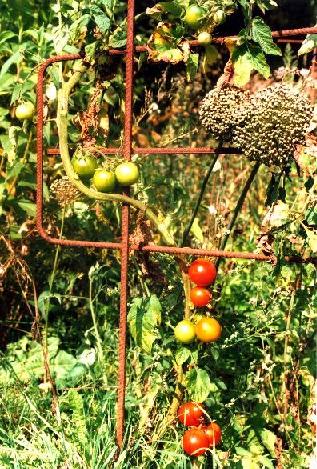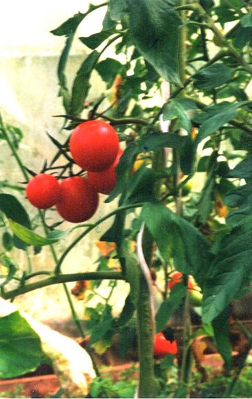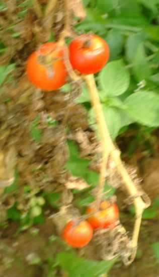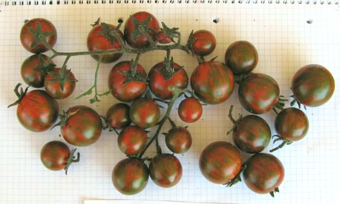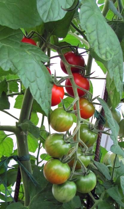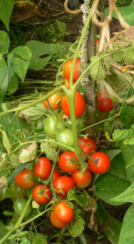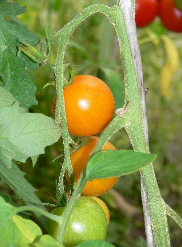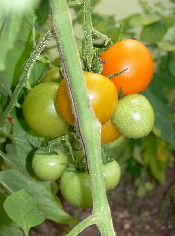 Kirschtomaten (bis 3cm) von 2,5m-Pfl., die selten platzen. Wohlschmeckend,