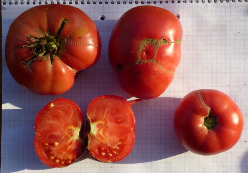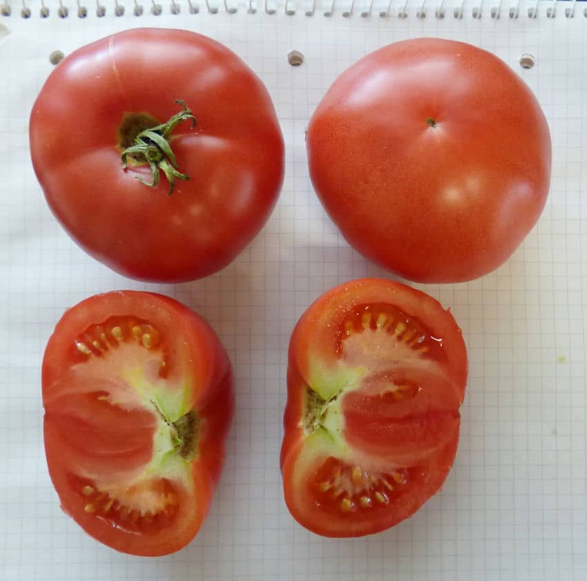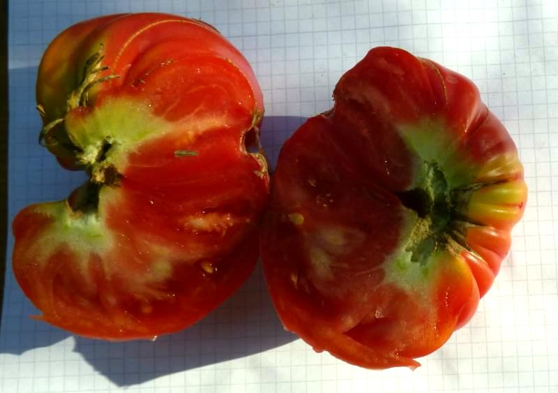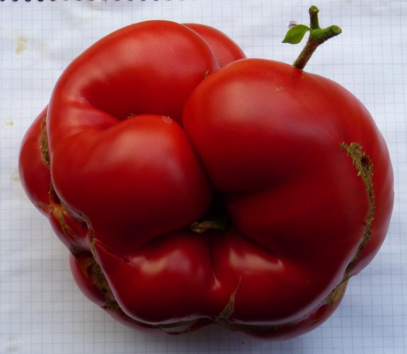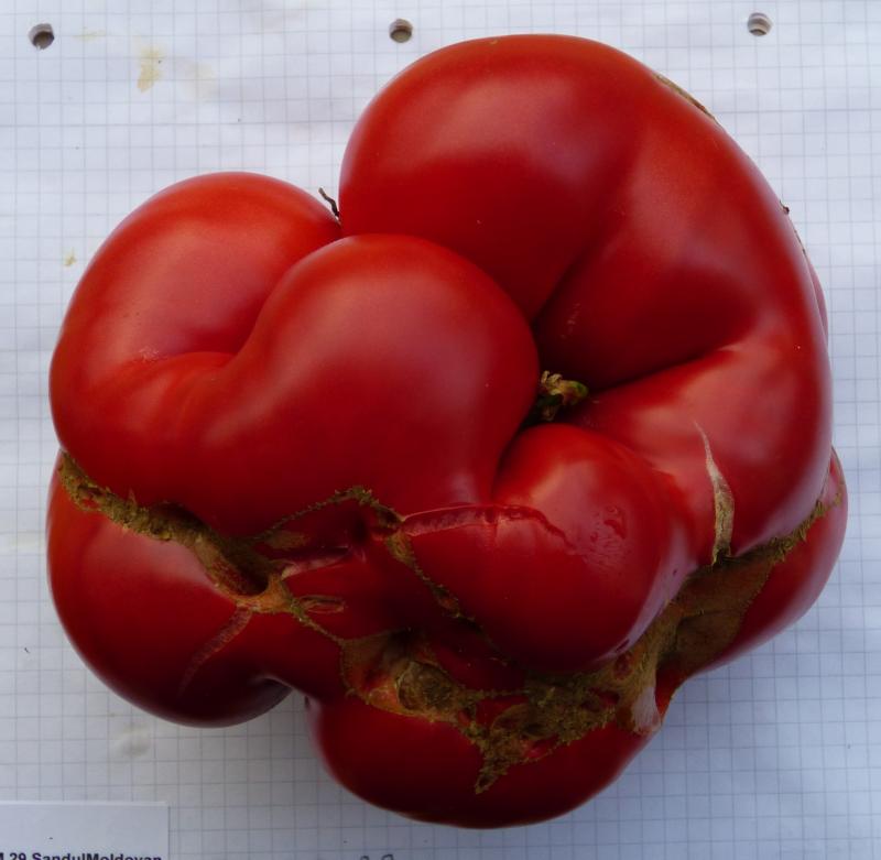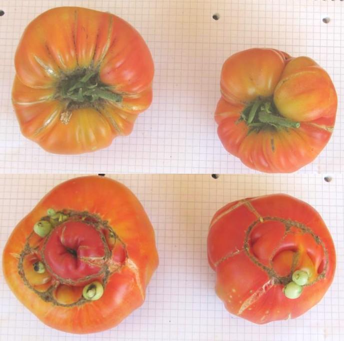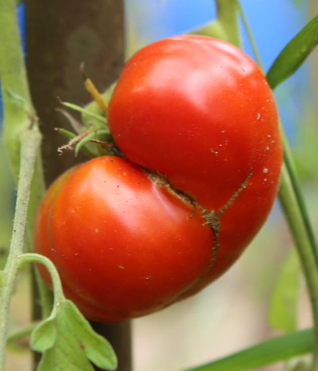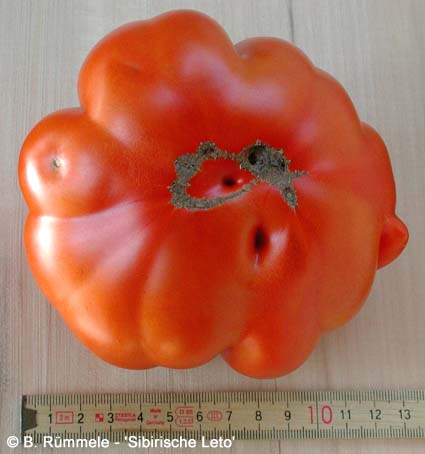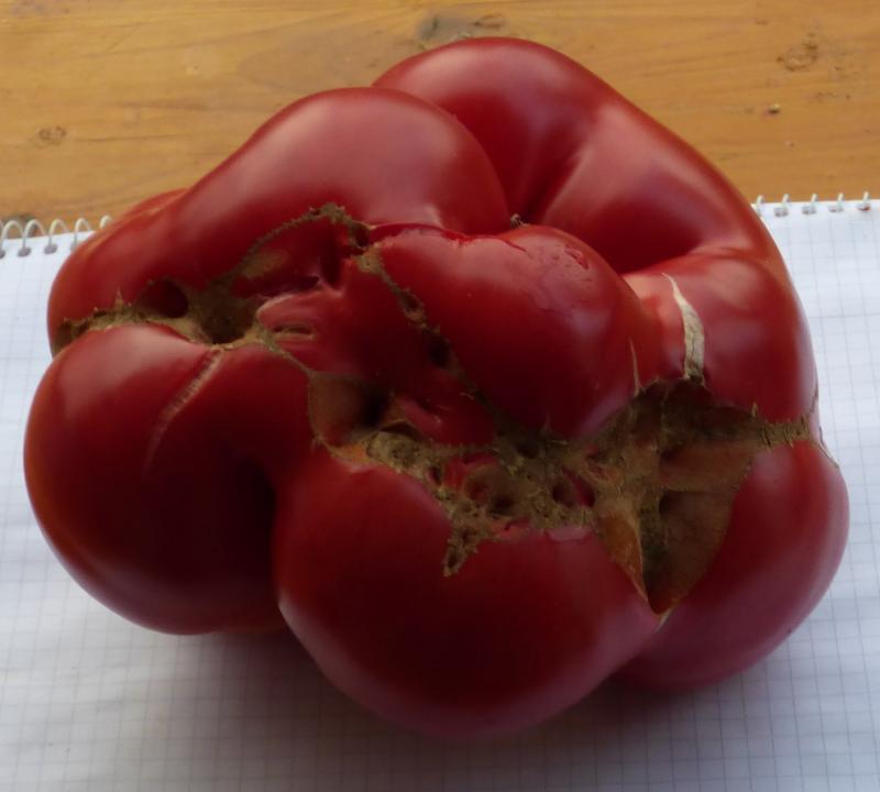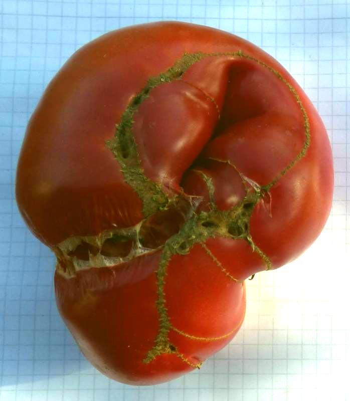 Riesen-Fleischtomate, manchmal beutelartig, am Stielansatz oft geplatzt