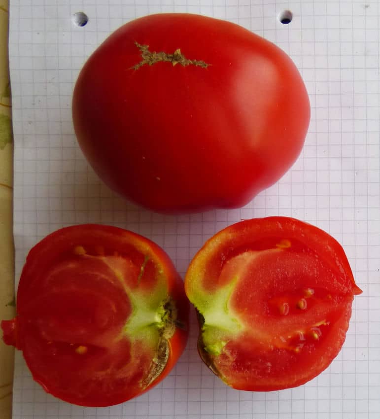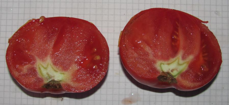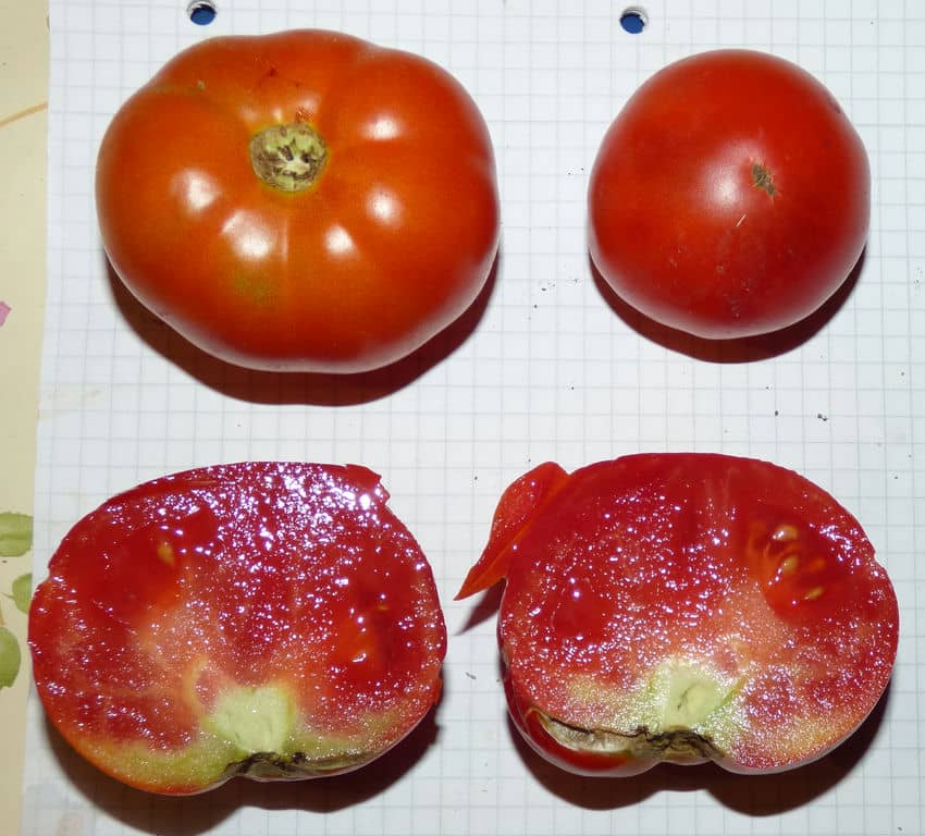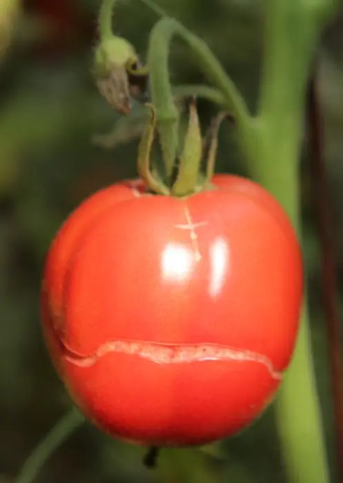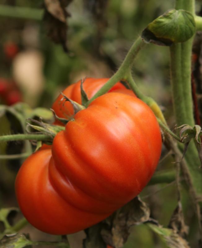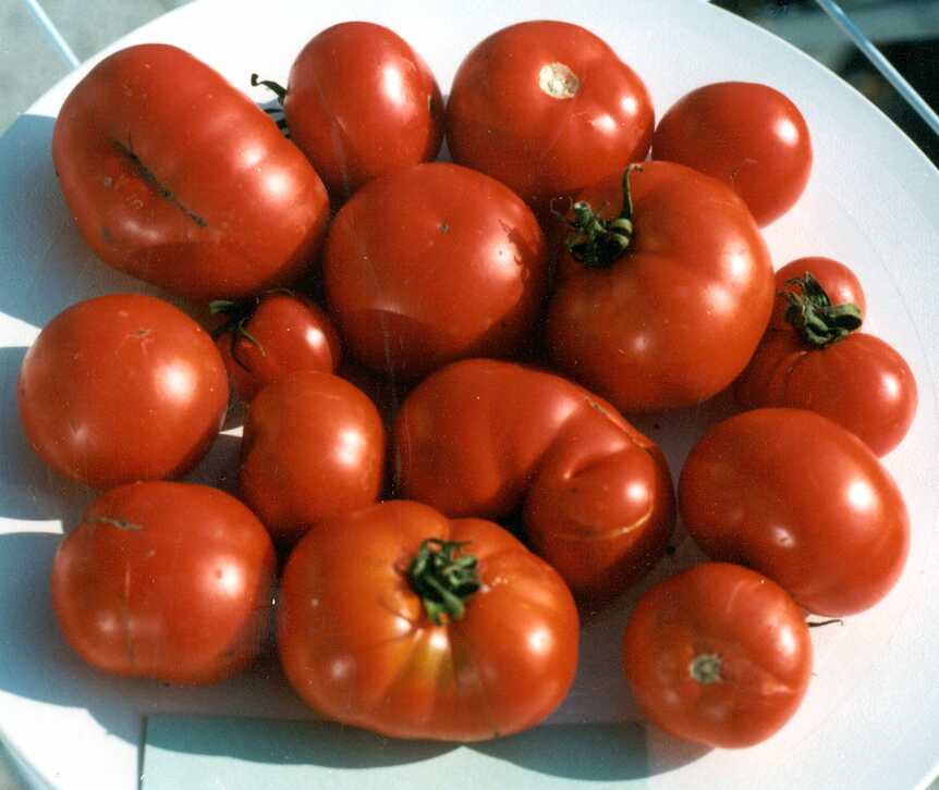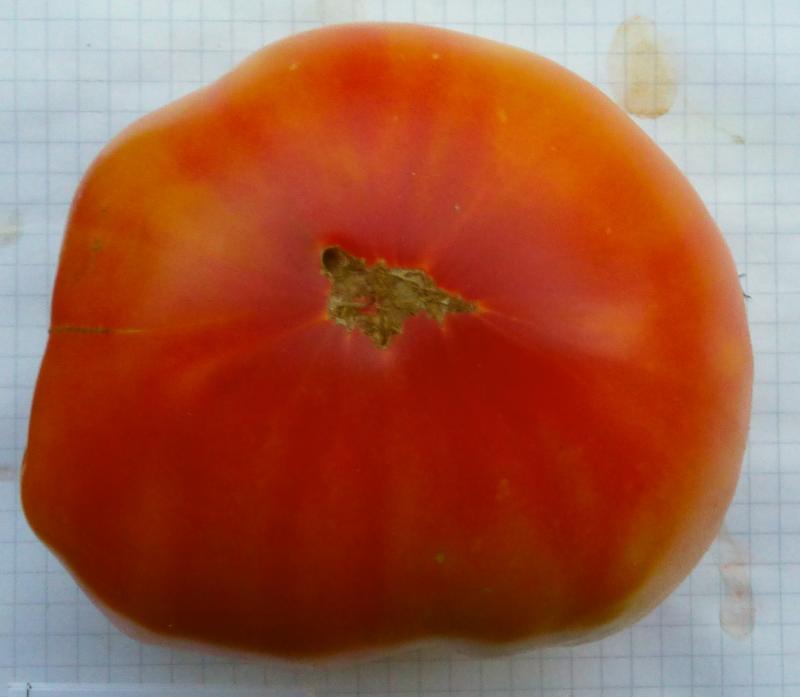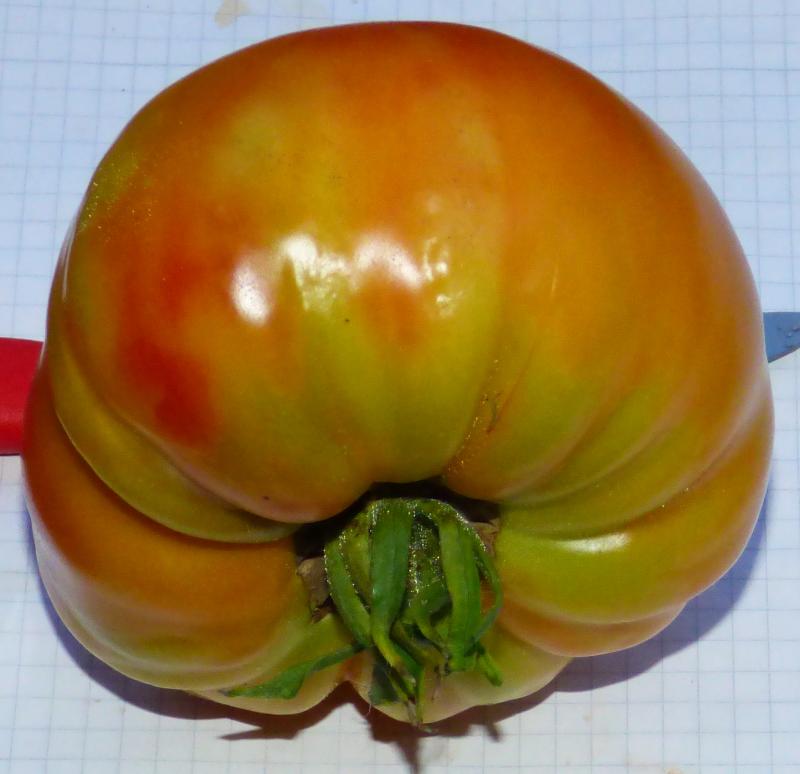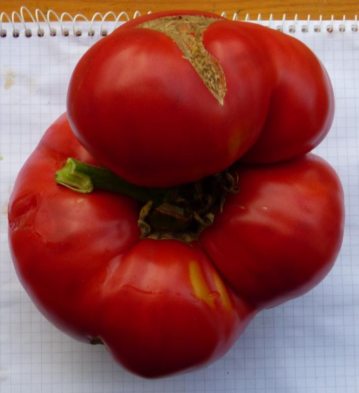 Riesen-Fleischtomate, manchmal beutelartig, am Stielansatz oft geplatzt