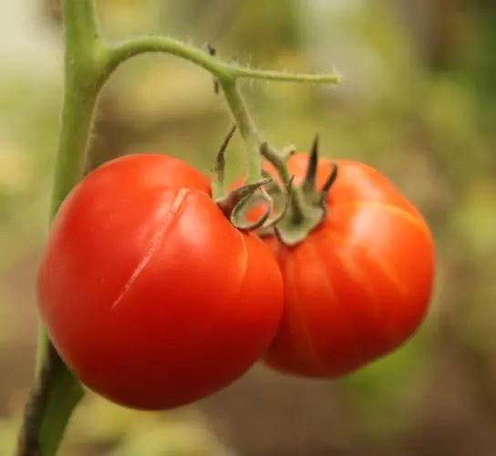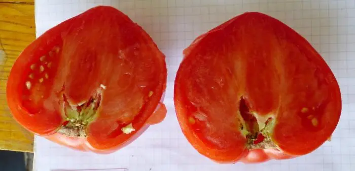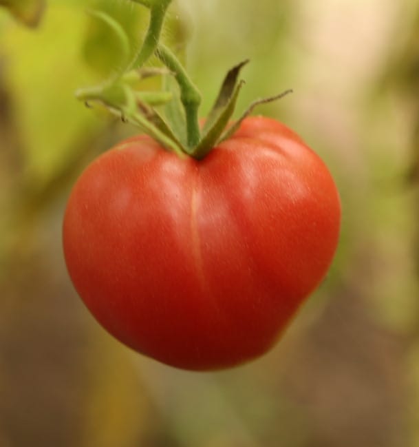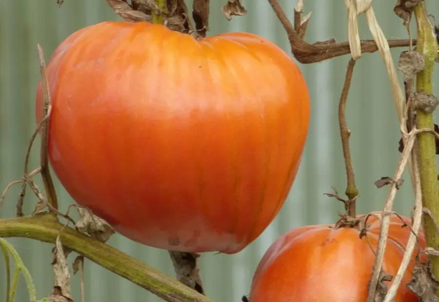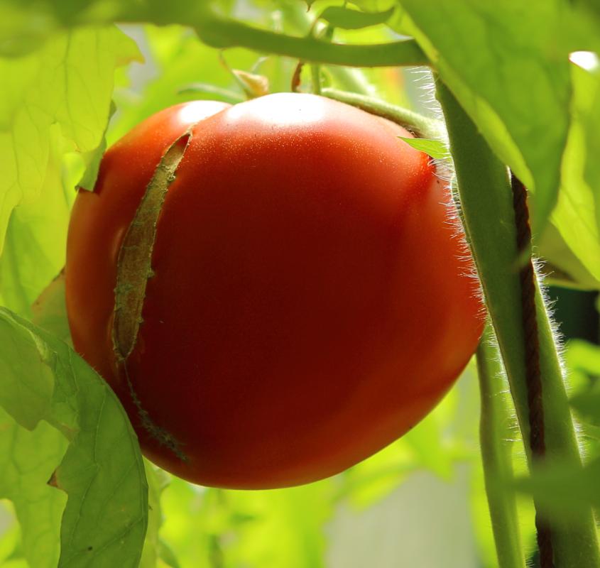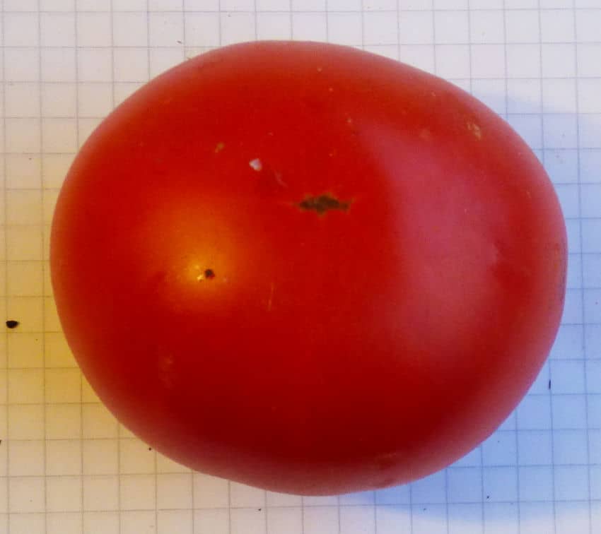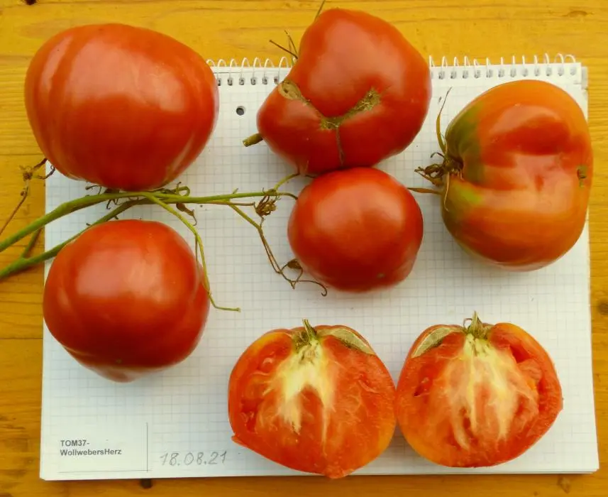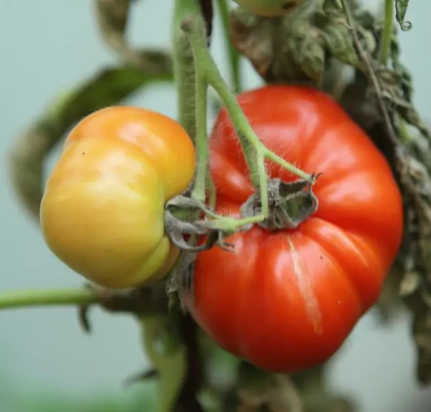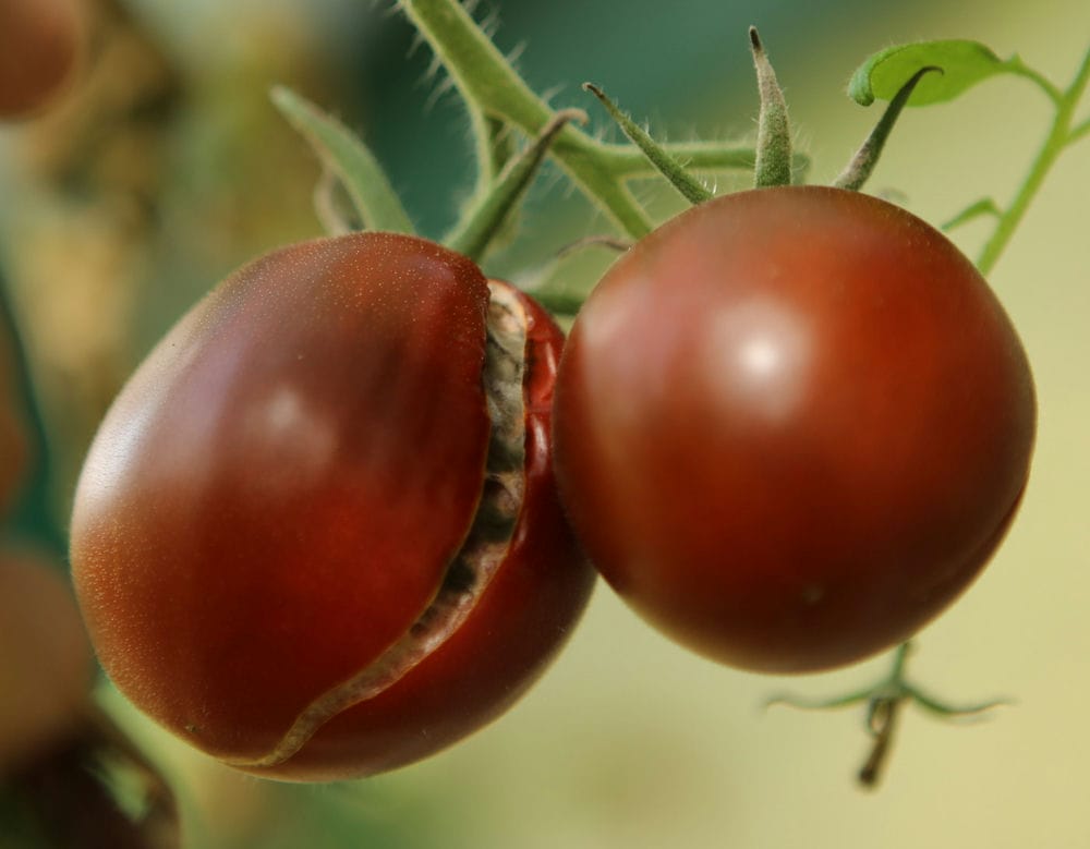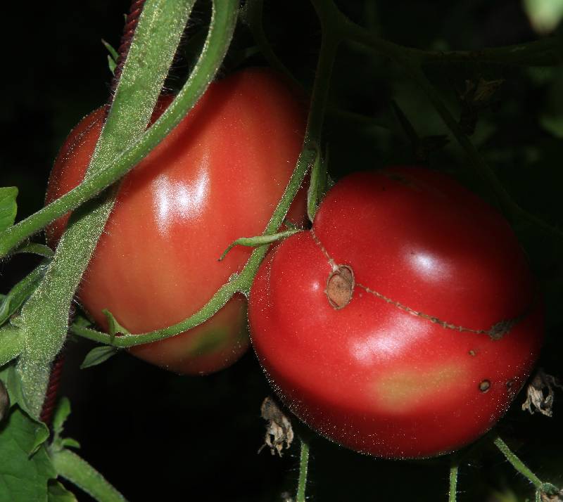 Riesen-Fleischtomate, manchmal beutelartig, am Stielansatz oft geplatzt