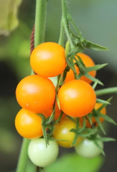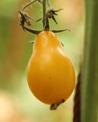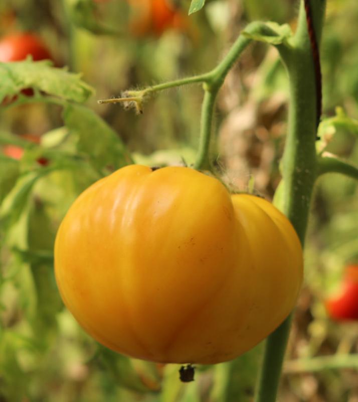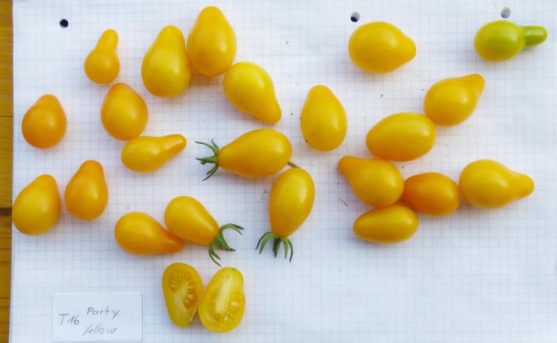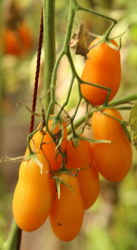 Sehr hohe Stabtomate, gelb-ovale Früchte 60-80g.