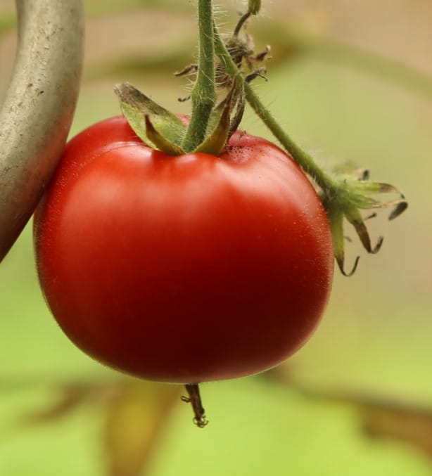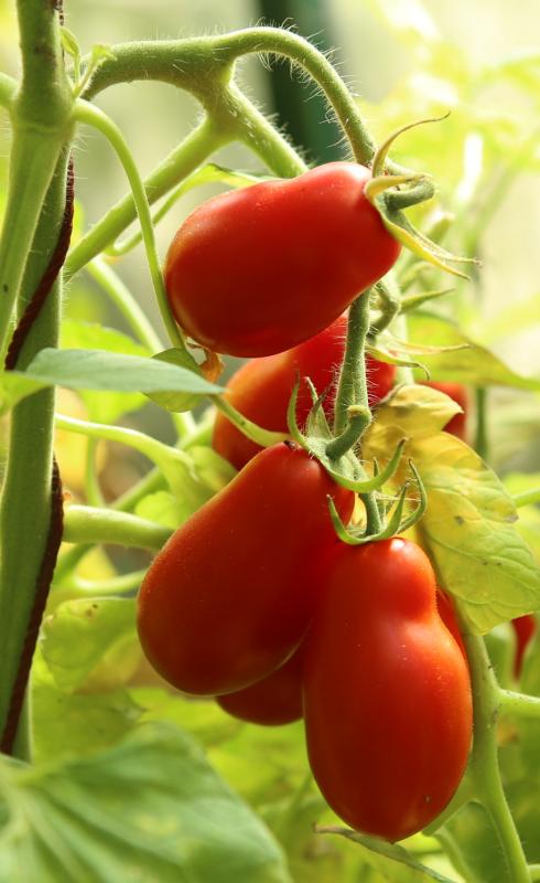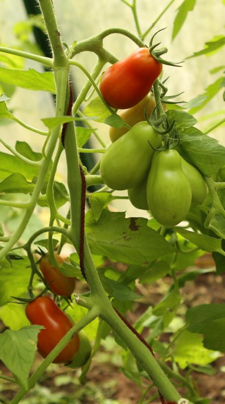 Erntebeginn. Stabtomate. Himbeerfarbige eher kleinkalibrige